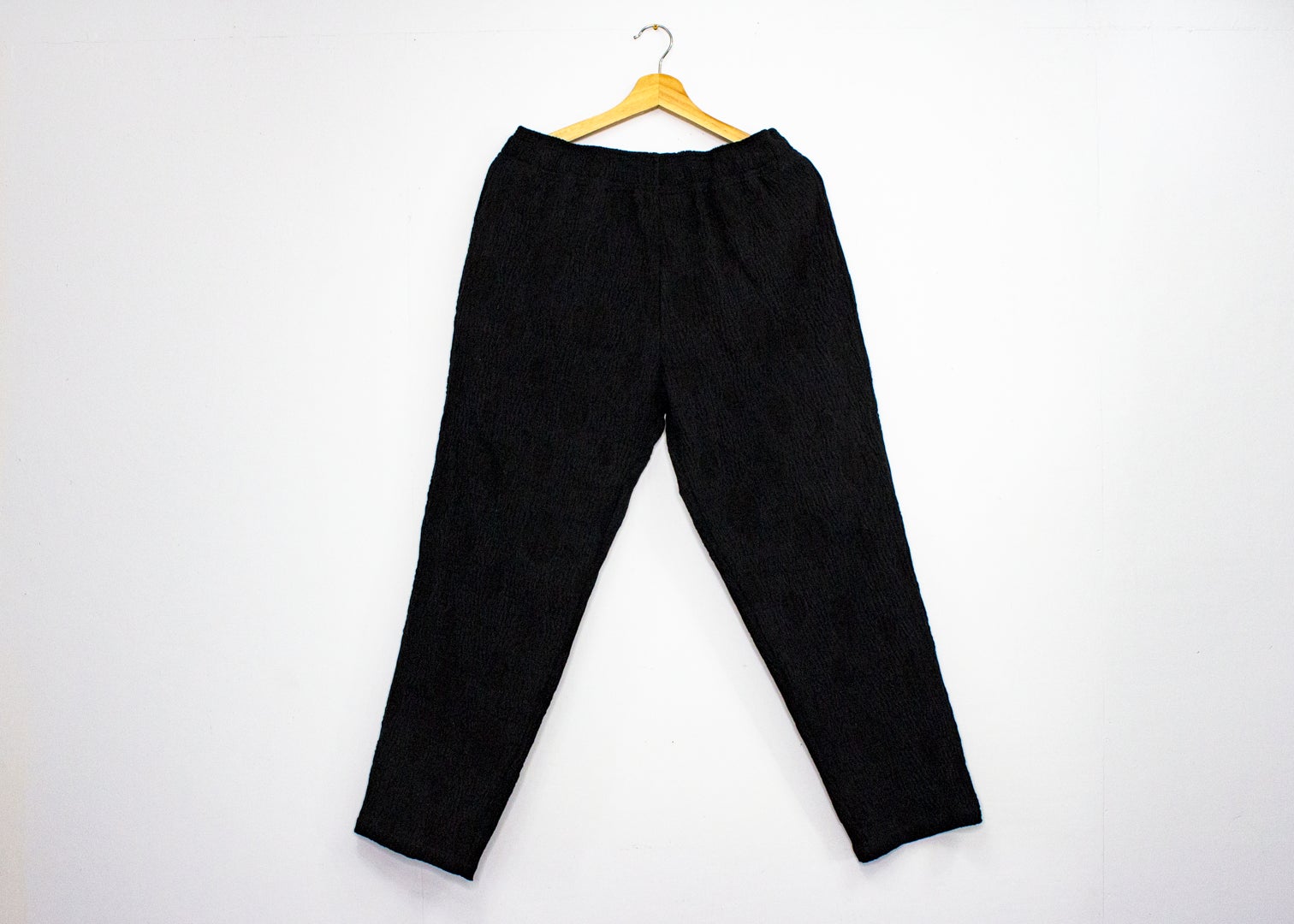 縫い絞り+塩縮加工によって表現されたやわらかいシワが特徴のパンツです。単色で染められていますが濃淡の異なるドット柄が特徴です。カラーは「ブラック・ネイビー・パールグレー・イエロー・グリーン」から1色お選びいただけます。