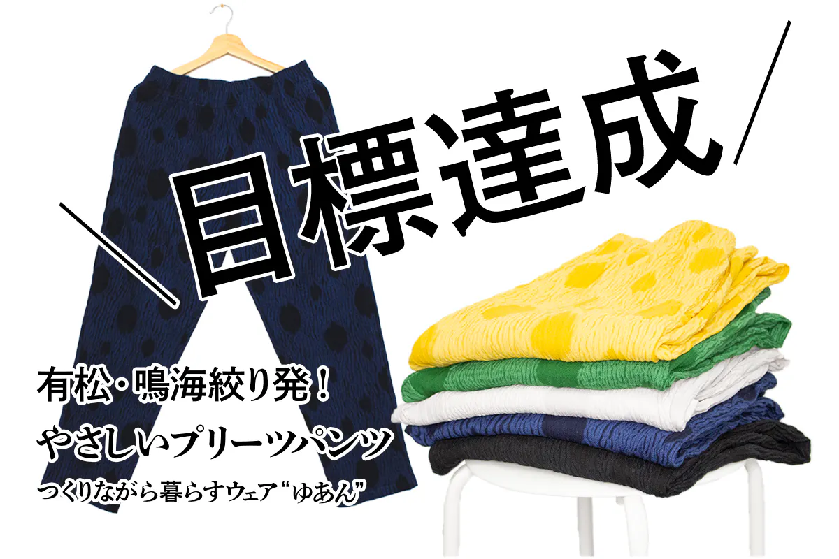 ゆあんのパンツは、縫い絞りという技法によって生まれたドット柄と生地の折りを活かし、塩縮(綿生地を化学的に縮ませる加工)と染色を加えることで、カジュアルな印象とやわかなストレッチ性を実現しています。スムーズな着脱をサポートする太めのウエストゴムや、サイズ調整のためのヒモがポイントがポイントで、男女ともに使えるフリーサイズとなっています。