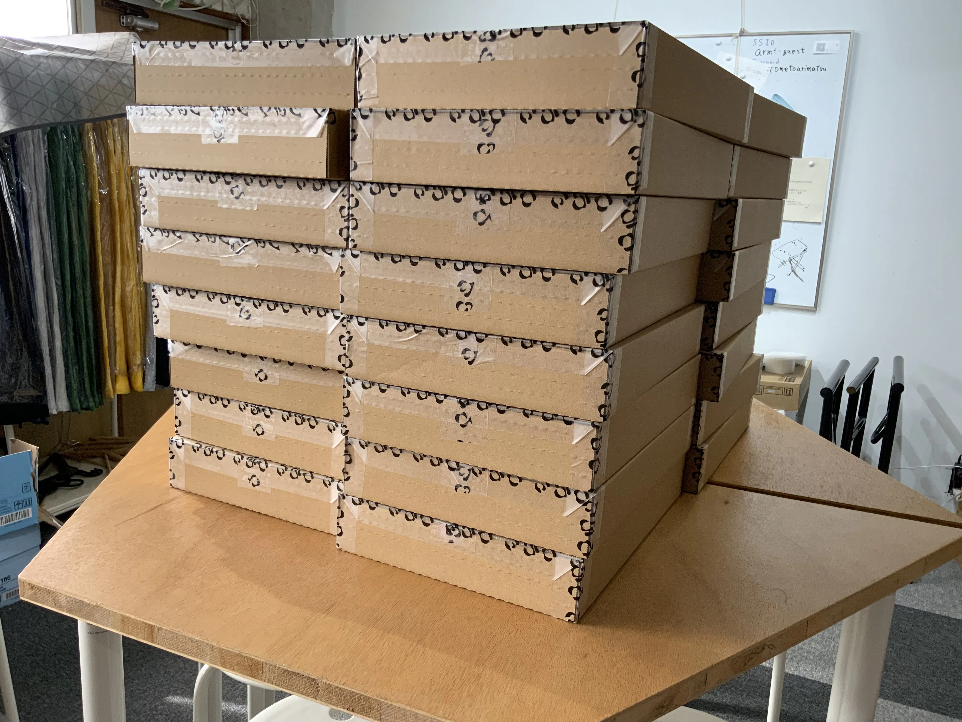 在庫としてダンボールに積まれていた塩縮加工された生地(左)、染色された生地(右)