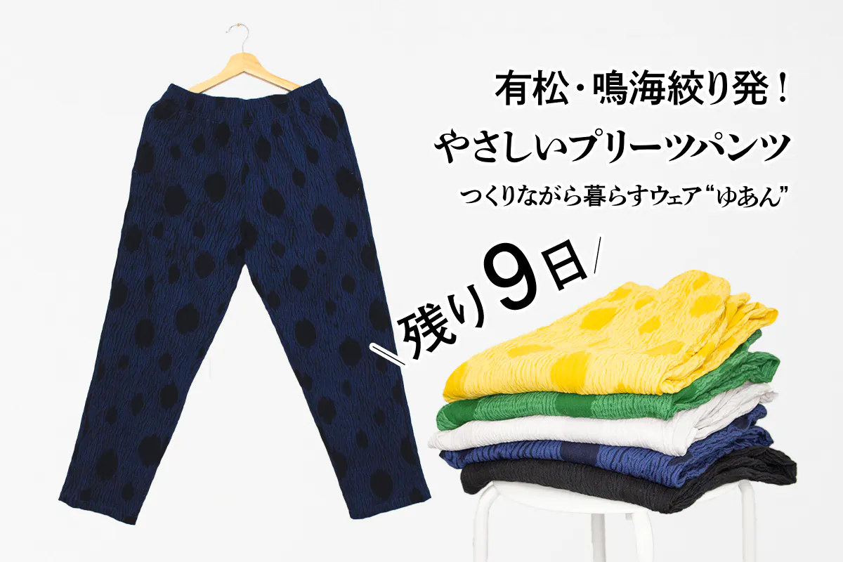 有松鳴海絞りの技法によって生まれた生地を用いて生み出した「ゆあんのパンツ」。