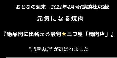旭屋肉店(東京都大田区)が、講談社 おとなの週末 2021.4 No,225に掲載されました。
