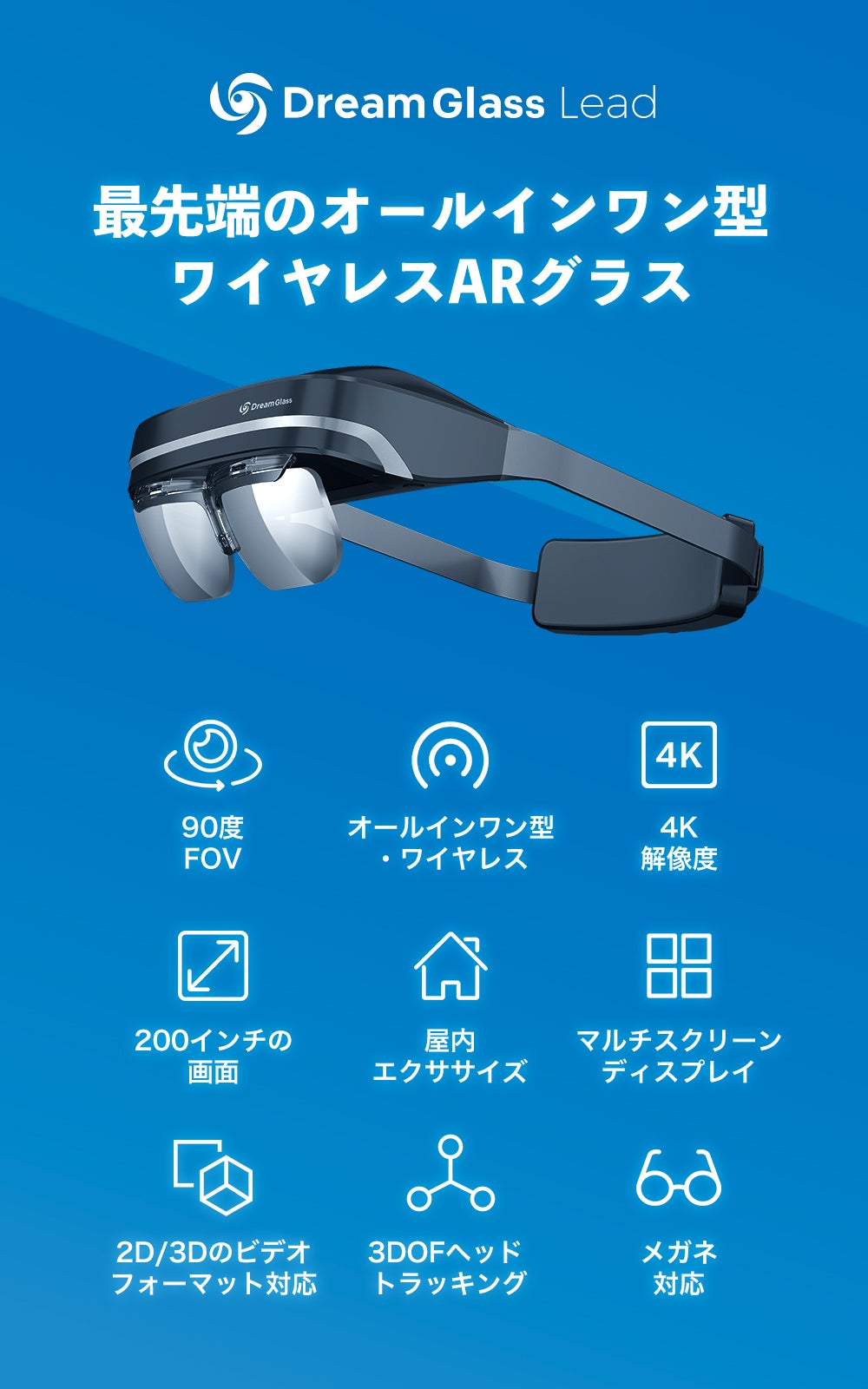 Dream Glass Leadは、映画体験を高める、巨大200インチARディスプレイに、90度視野角(FOV)を備えて、現実世界に自然に融合します。遊びや仕事に関わらず、3D、4K、パノラマ表示も利用し、全てがとてもリアルに見えます。未来の4Kの夢の様な体験を体感してください。