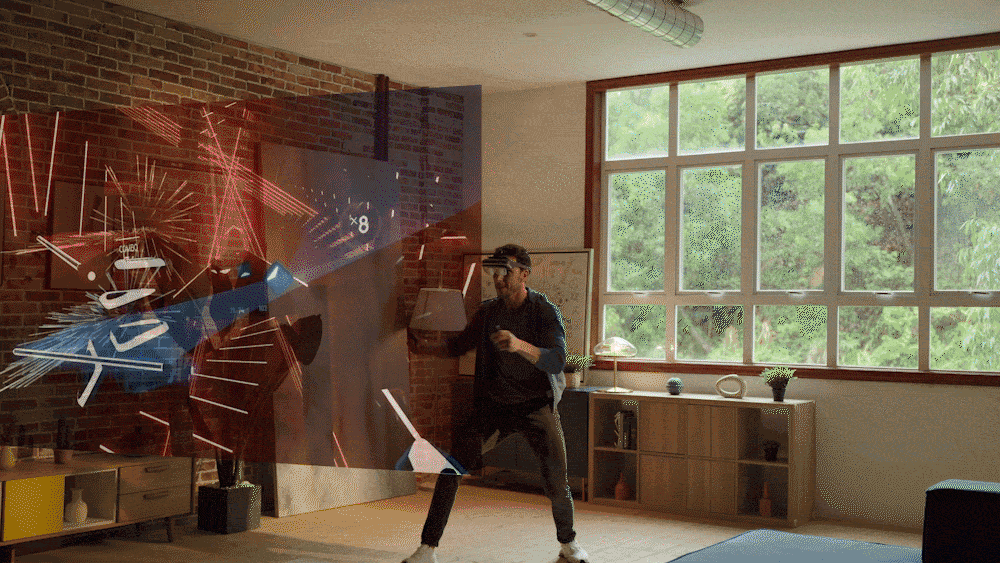 動きを制限するケーブルや配線が無いので、気にせず自由に動けます。ARグラスは頭の動きを瞬時に追跡して、どの方向を向いても200インチの大画面を、常に最も見やすい位置に自動的に動かしてくれて、直感的なコーチングを提供してくれます。今までのVRヘッドセットの様に、家具にぶつかったり、周りの人を誤って殴ってしまったりということはもうありません。サラウンディング注意機能が周囲との衝突を予防してくれます。