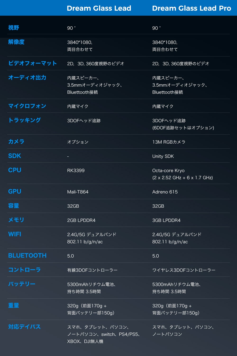 Dream Glass Lead Proは通常バージョンのエンターテインメント機能を全て搭載していますが、それに加えて自由度6のトラッキングやSDKの様に、開発向け、企業向けアプリの機能を追加で搭載しています。また、より高速なレンダリング能力を得るために、より強力なプロセッサも備えています。Steam 3Dゲームプレイとの互換性もあります。