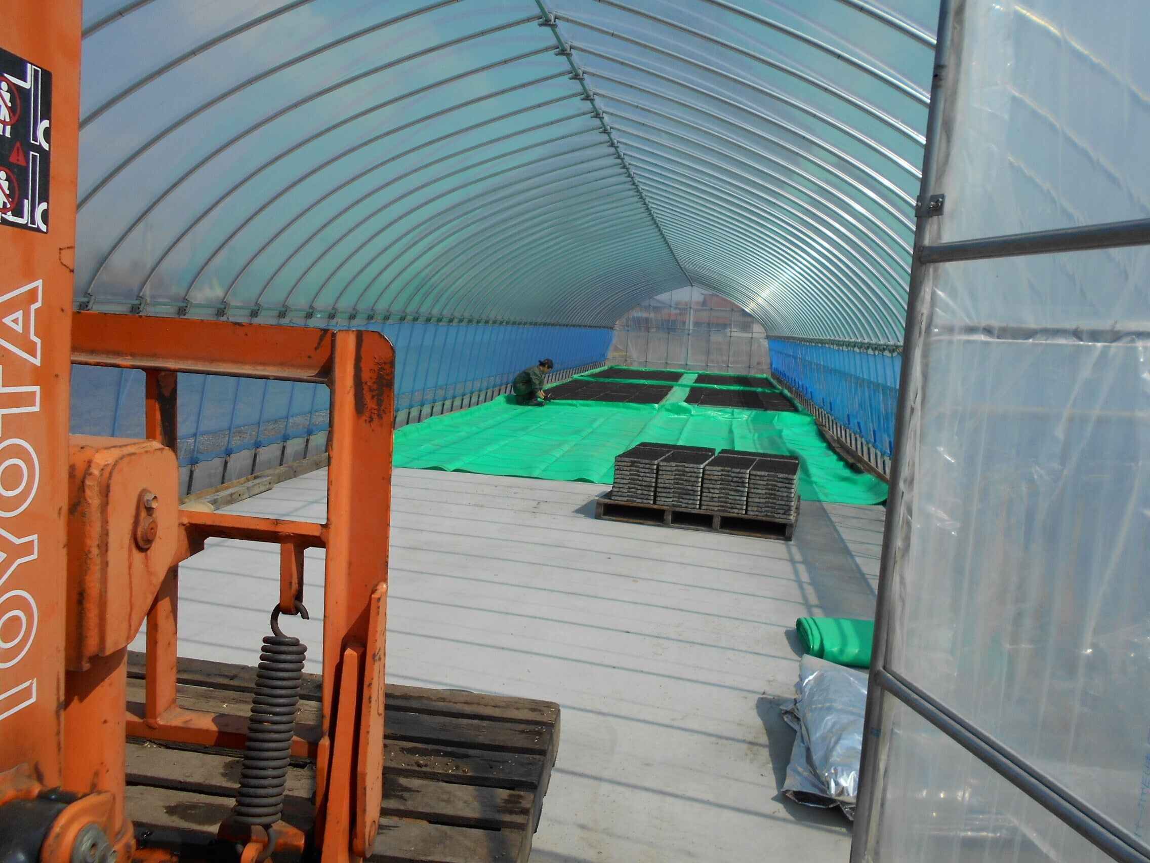 沢山の人の支援ありがとうございます。4/1にコンクリート打設したハウスに種を蒔いた苗箱並べました。厚めのビニールシートを敷き並べます。シート1枚毎に区切りを付けて並べて芽が出て緑化したら水を入れてます。プール育苗というやり方です。まだ秋田は、ハウスの中でも最低気温0℃になります。日中最高気温ハウスの中で35℃以上になることもありますので4から5日は、目が離せません。ハウスの裾の開閉で30℃以上にならないようにします。今の時期水稲モードになってしまいます。 高関上郷農場の藤井清徳