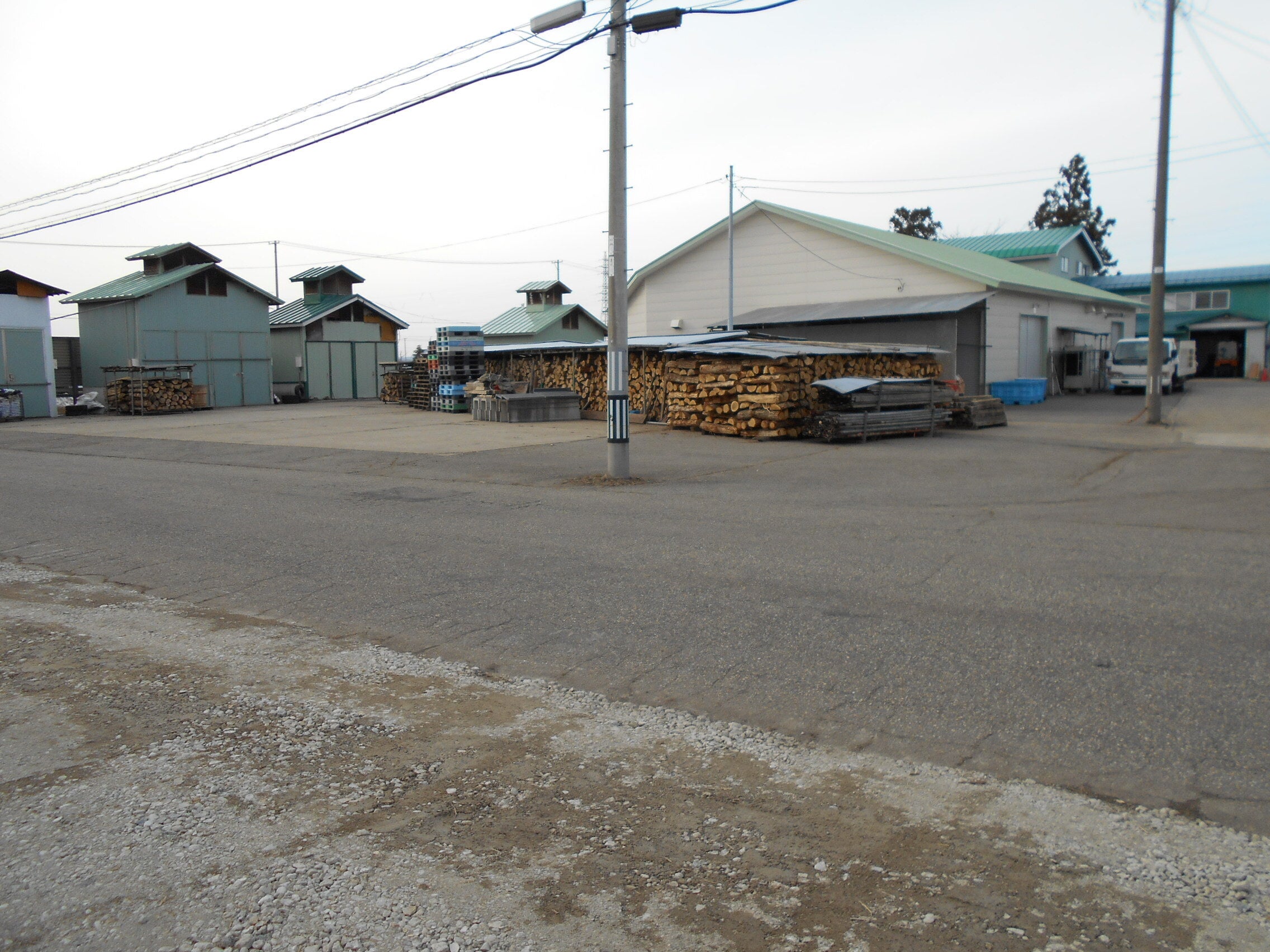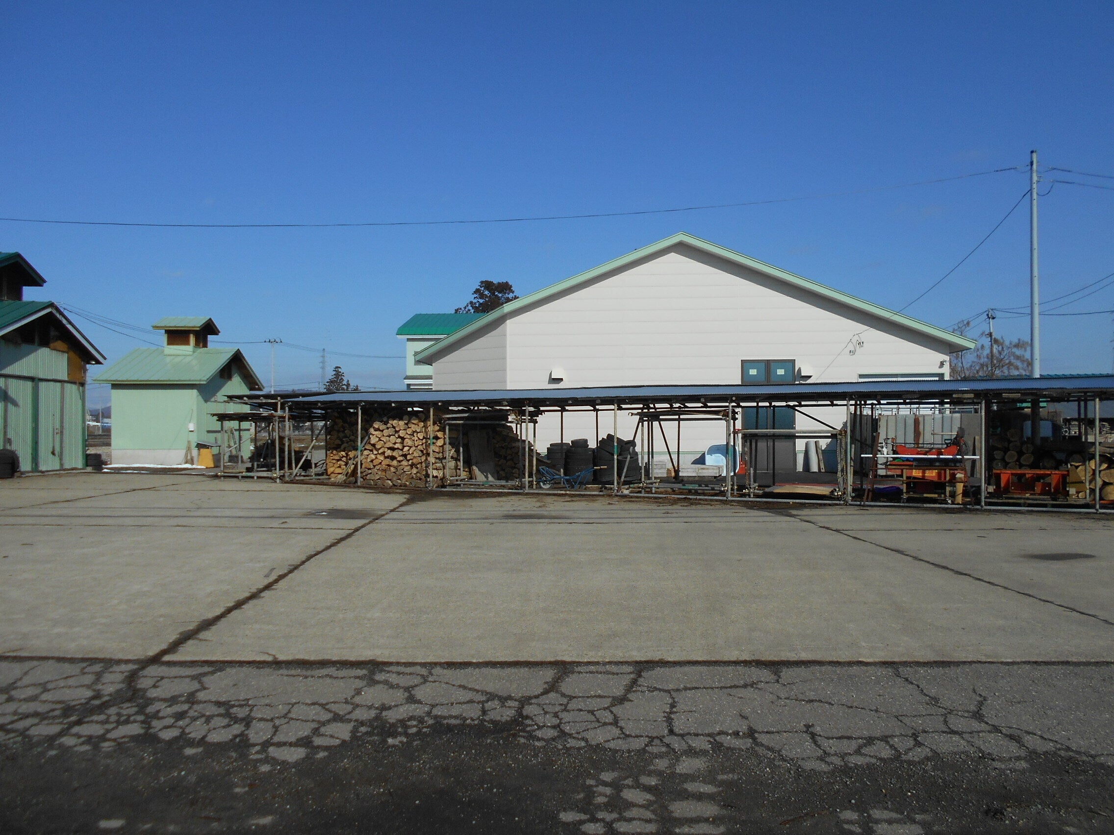 ご支援ありがとうございます。例年よりも早めに薪が配達されました。薪割機にいれるため90cmの長さにして持てる大きさに薪割します。雨を防ぐために上だけに覆いをして乾燥させます。梅雨の雨は厳禁です。燻し具合かうまくいきません。GIの決まりで広葉樹となっていますが火力のあるナラが大半です。左側の煙抜きのついている建物がいぶり小屋で1棟で2部屋になっています。1部屋1000ほどつりさげます。奥の建物が大型冷蔵庫併設の加工用建物です。9間*13間=117坪で冷蔵庫が4間*6間=24坪 となっています。 高関上郷農場の藤井清徳