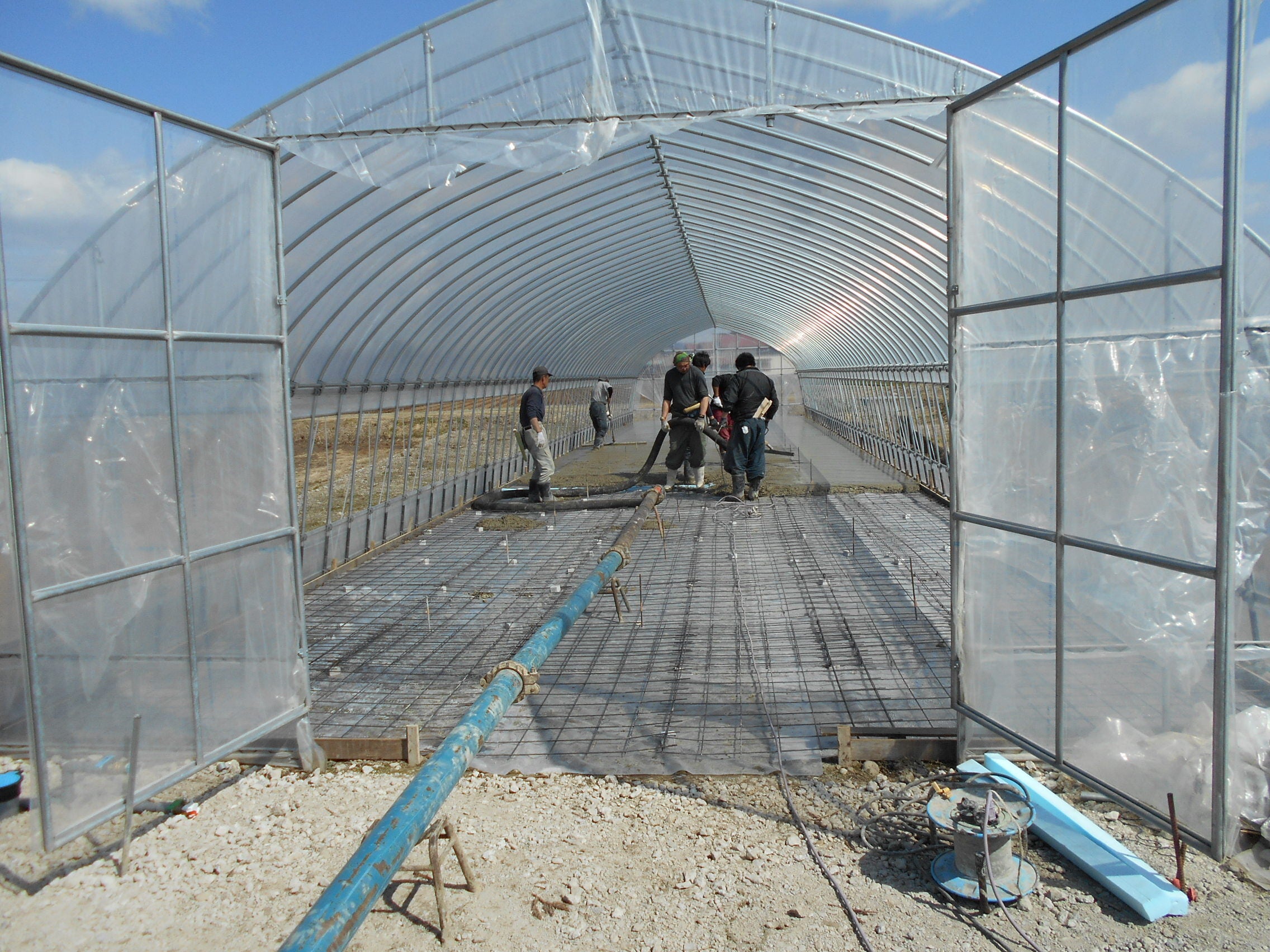B棟ハウスにコンクリと打設しました。支援ありがとうございました。引き続き知人とかにお知らせ頂ければ幸いです。晴天で最適な打設日です。固まったらコンクリートの上に厚めのビニールシートを敷きその上に種を播種した苗箱並べます。発芽し緑色になったら水を張り込みます。育苗時の病気も少なく散水もやらないで丈夫な苗になります。4/20頃に播種しならべます。その頃写真はりつけます。 高関上郷農場の藤井清徳