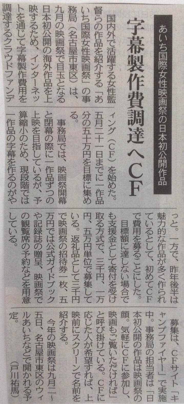 おはようございます。あいち国際女性映画祭2021 エグゼクティブプロデューサーの各務でございます。 当プロジェクトに御支援くださった皆様、関心をお寄せいただきました方々におかれましては、活動報告をご覧いただき誠にありがとうございます。 タイトルにもありますとおり、この地域の有力紙である中日新聞さんに当プロジェクトを紹介して頂きました! 一般の方が多く読まれる一般紙を通じて、寄付募集の大きな弾みになることはもちろん、少しでも私たちが準備している映画祭を知ってもらう、関心を持ってもらう大きなチャンスを頂いたと感じております。 スタッフ一同、より一層準備を加速してまいりますので、引き続きのご支援ご協力どうぞよろしくお願い申し上げます。