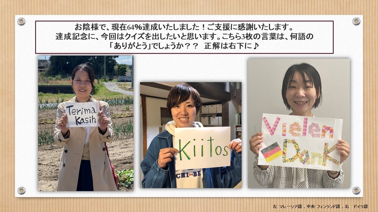 お陰様で、現在64%達成いたしました!ご支援に感謝いたします。