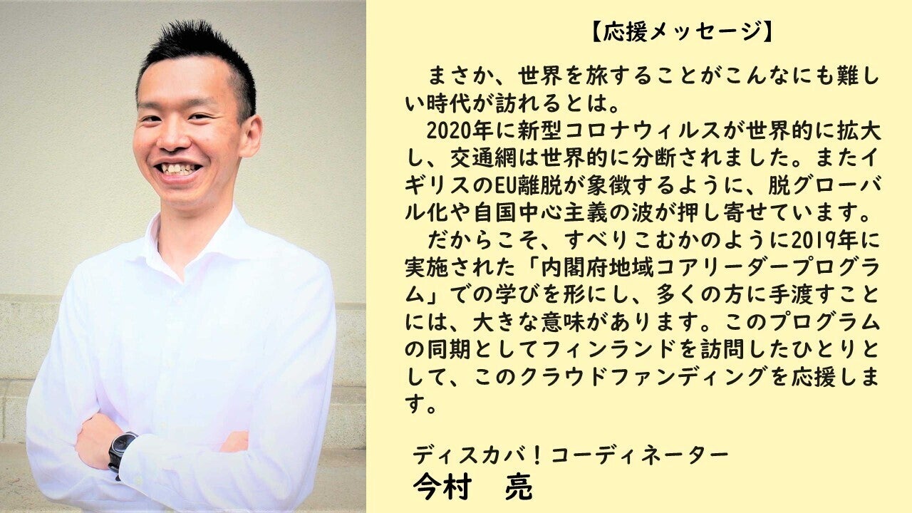 高校生のためのキャリア支援プロジェクトを実施されている「ディスカバ!(https://discova.jp/)」コーディネーターの今村亮さんから応援メッセージをいただきました。
