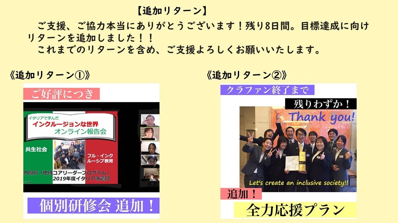 残り、8日となりました。そこで、リターンを追加いたします!!