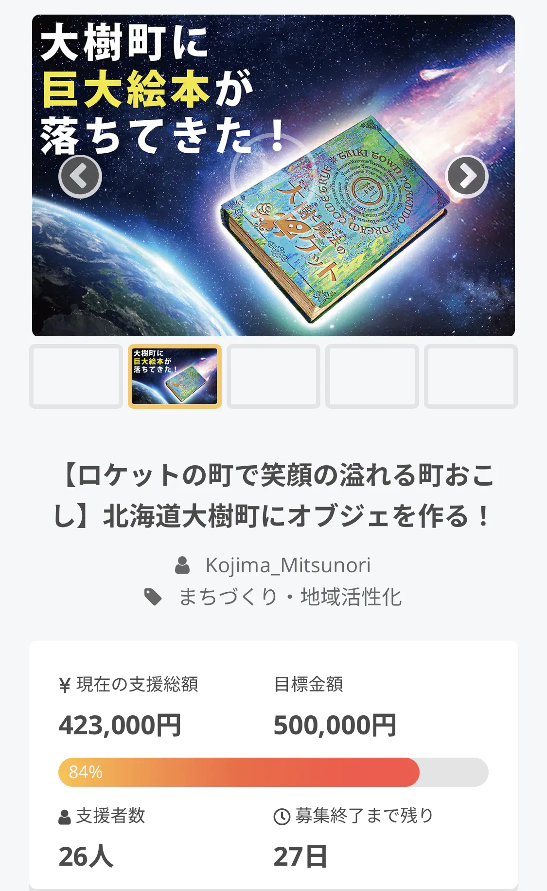 現在、26名の方にご支援いただき、支援額423,000円、達成率84%となりました!ご支援いただいた皆様方、本当にありがとうございます!