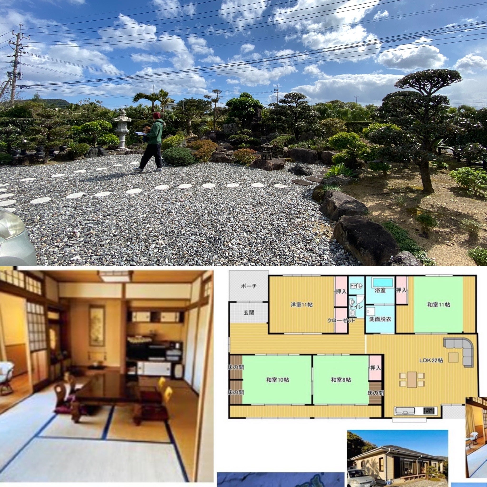 『神のお宿』となる建物はビーチまで徒歩3分、夜差家本家の目の前(道路側敷地内)に建つ約150坪に広がる日本庭園が美しい築20年の和式建物です。大変珍しい琉球畳の和室(18畳部分)を客室としてご用意させて頂き、内装も外観も手を加えず出来る限りこのままの状態を維持、管理させて頂きながら、暮らしやアトリエ利用、オーナー制度、紹介制度のお宿として使わせて頂く考えでございます。