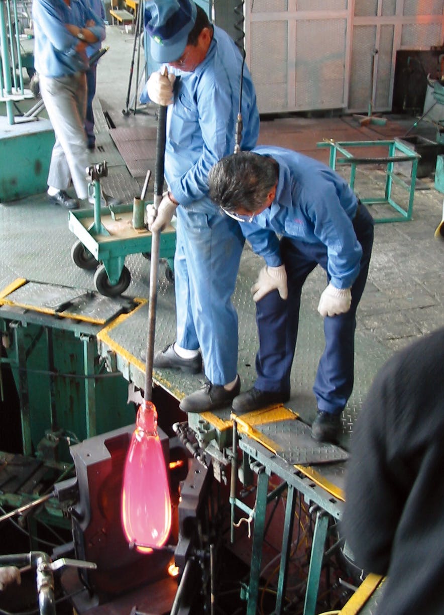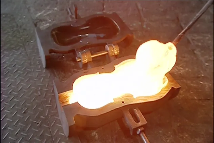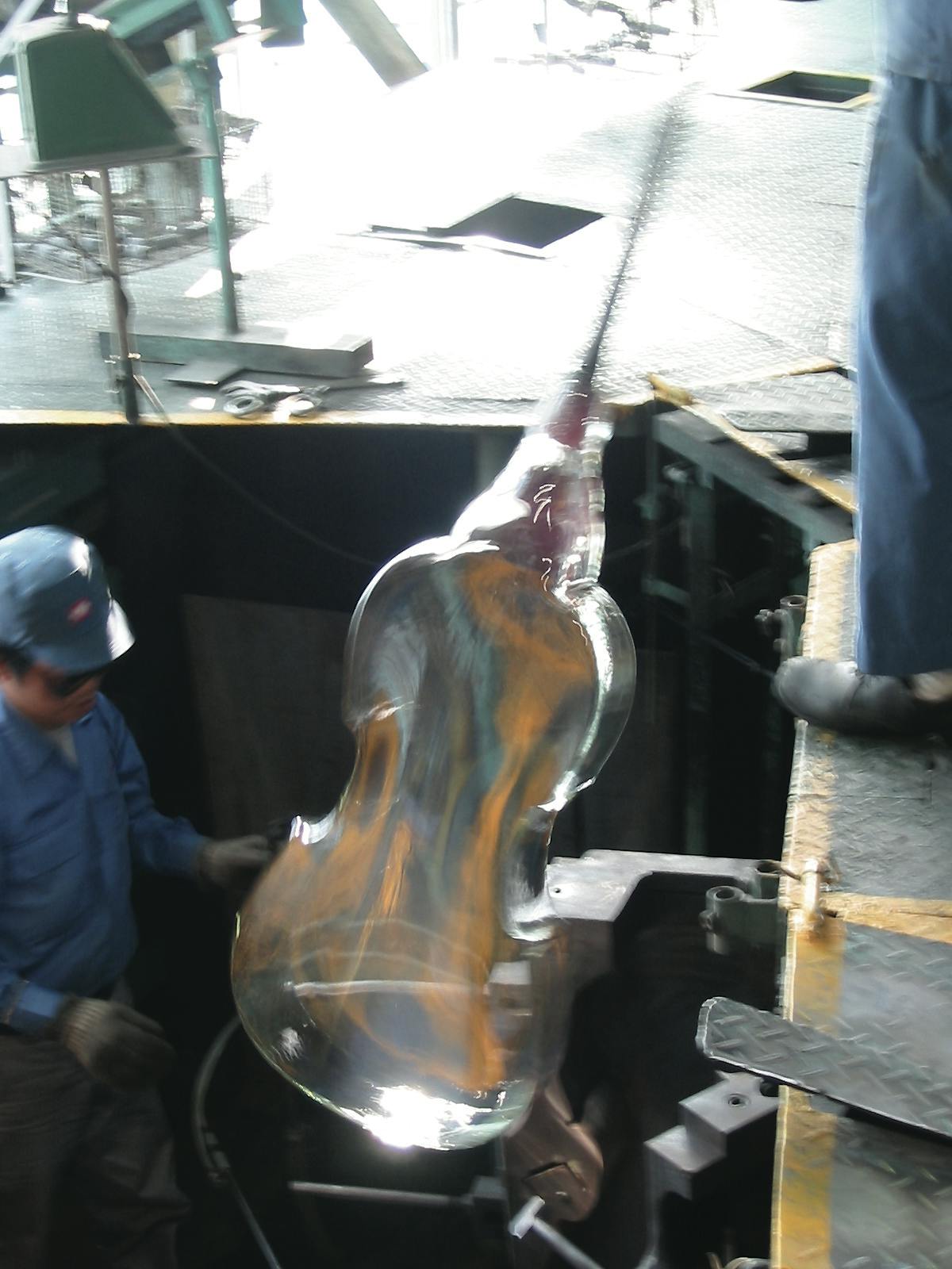 バイオリンの形をした型に溶けたガラスを入れ、息を吹き込み成形します。成形した肉厚が一定にならなければならないので、培った経験を頼りに勘で吹き込む息の量を調節します。