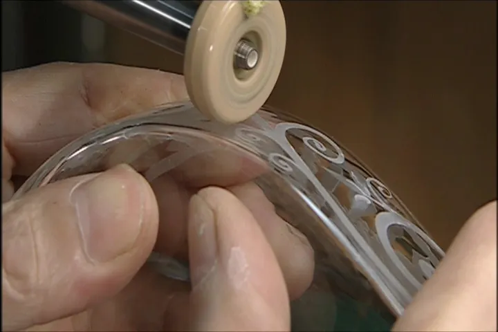 いよいよバイオリンらしくなったガラスのボディにグラビール(彫刻)の装飾をし、グラスアートペインティングを施します。