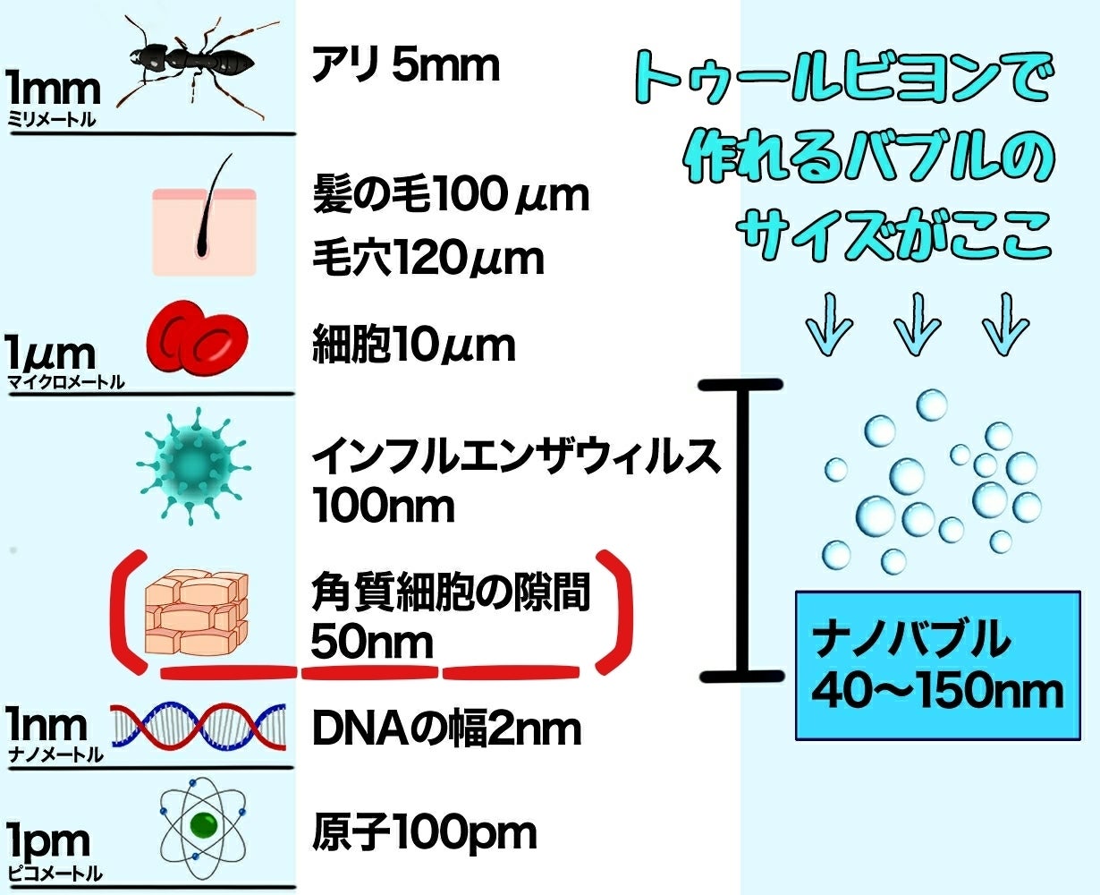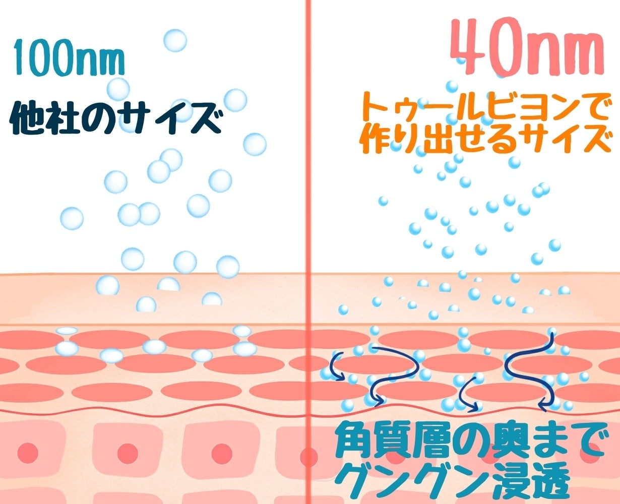 肌の角質細胞の隙間は50nmや60nm前後だと言われており、それよりも小さくすることで、化粧水を付着させたまま角質層の奥まで届けることが期待できるのです。