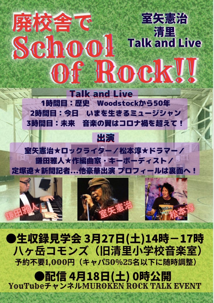 旧清里小学校音楽室(現 八ヶ岳コモンズ)において、室矢憲治さんと、日本の音楽界ランナー達が、音楽の特別授業(トークとライブ)を行います。