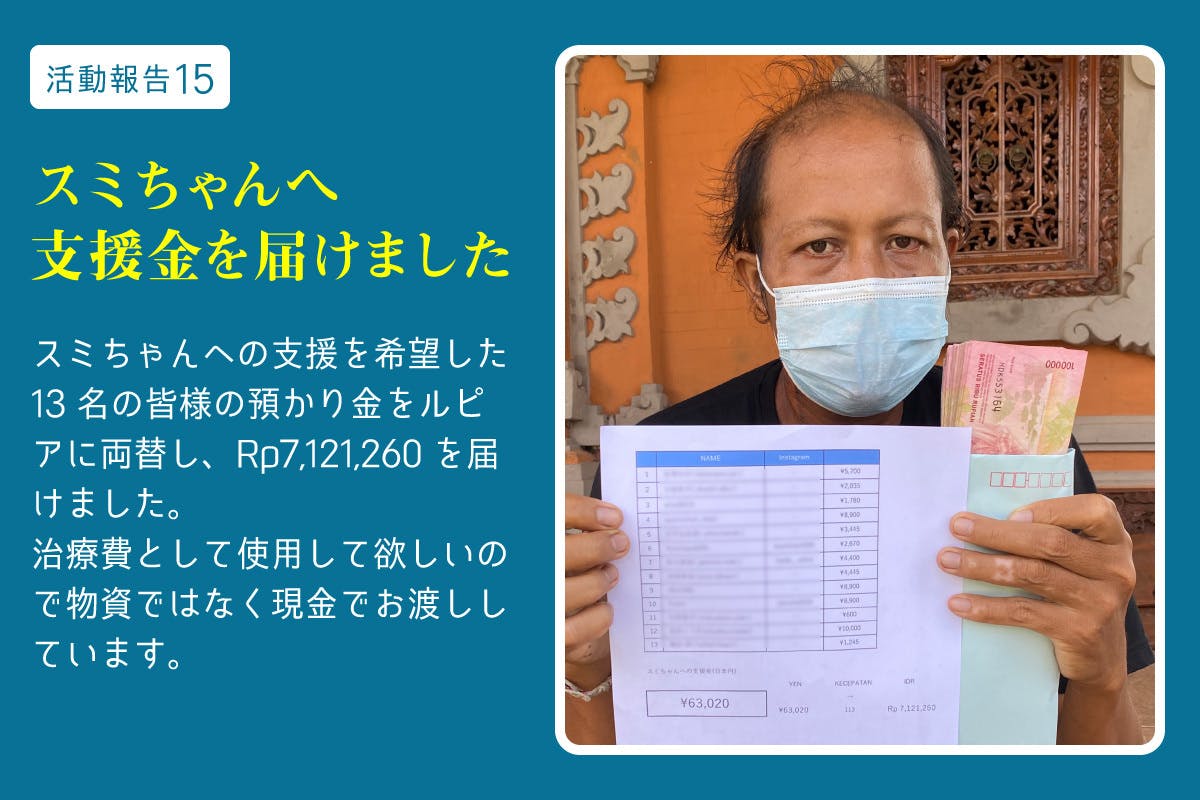 スミちゃんへ支援してくださった13名の皆さんからお預かりした支援金、7,121,260Rpをお届けいたしました。スミちゃんには治療費に使用して欲しいので、支援物資ではなく現金でお渡ししています。