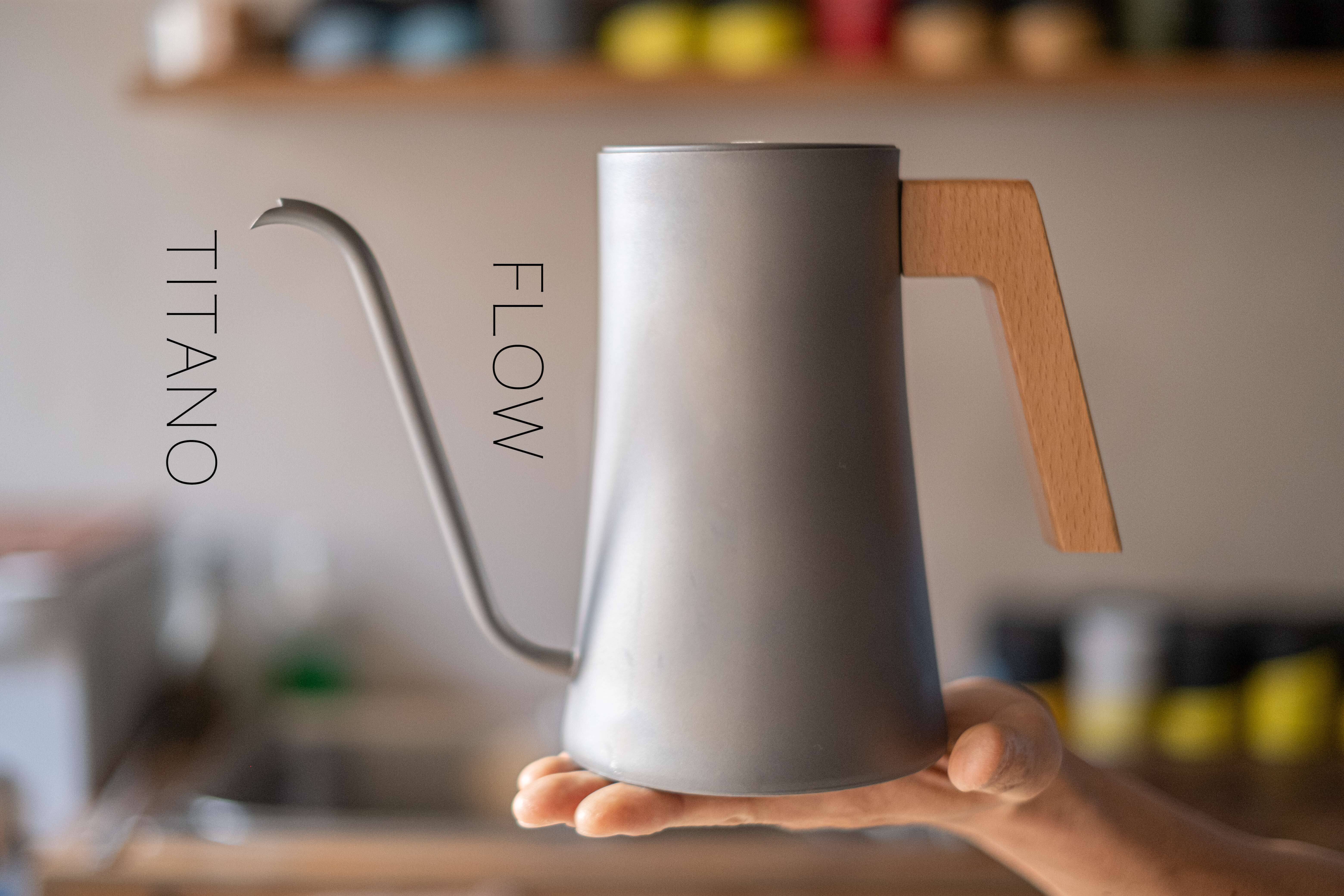 チタン製ケトル「FLOW(フロー)」は、チタン製品の専門ブランドである「TITANO(チタノ)」が開発したハイエンドケトルです。医療現場で使用されるグレードの純チタンをすべてのパーツに使用し、機能性とデザイン性を兼ね備えたアイテムです。