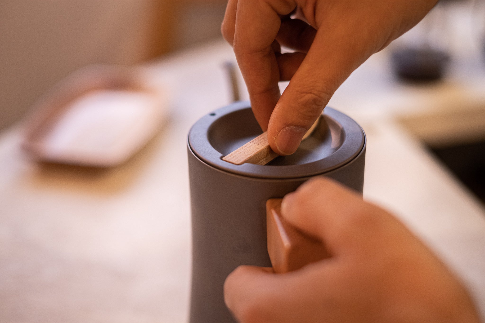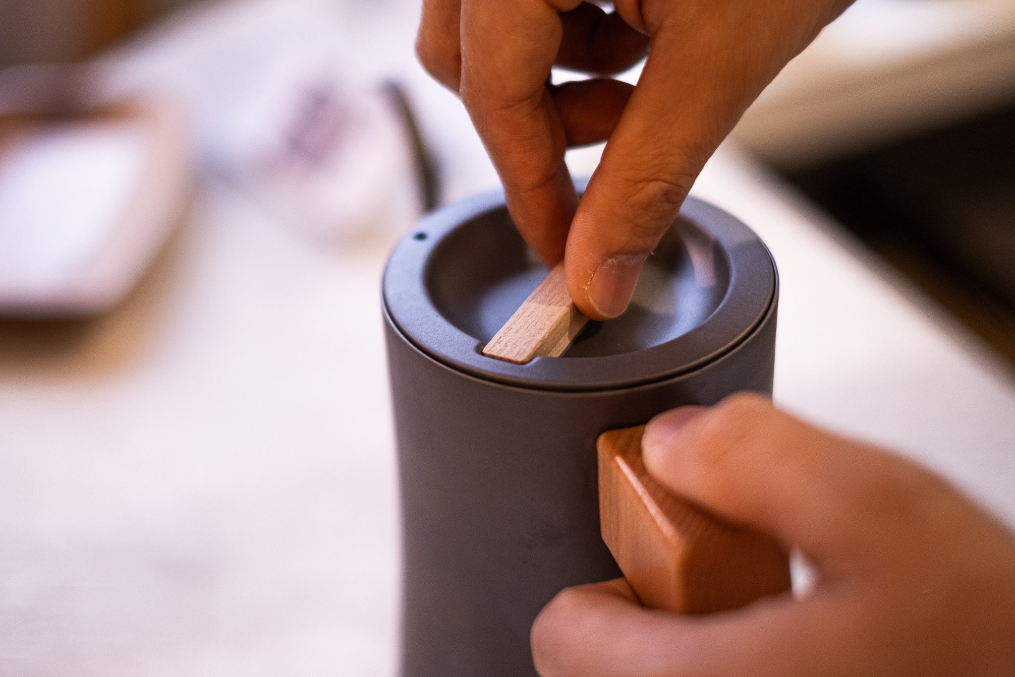 フタには簡易的なロック機構が設けられており、本体にセットしてツマミを回すことで、本体を傾けたときにフタが落ちてしまうのを防いでくれます。