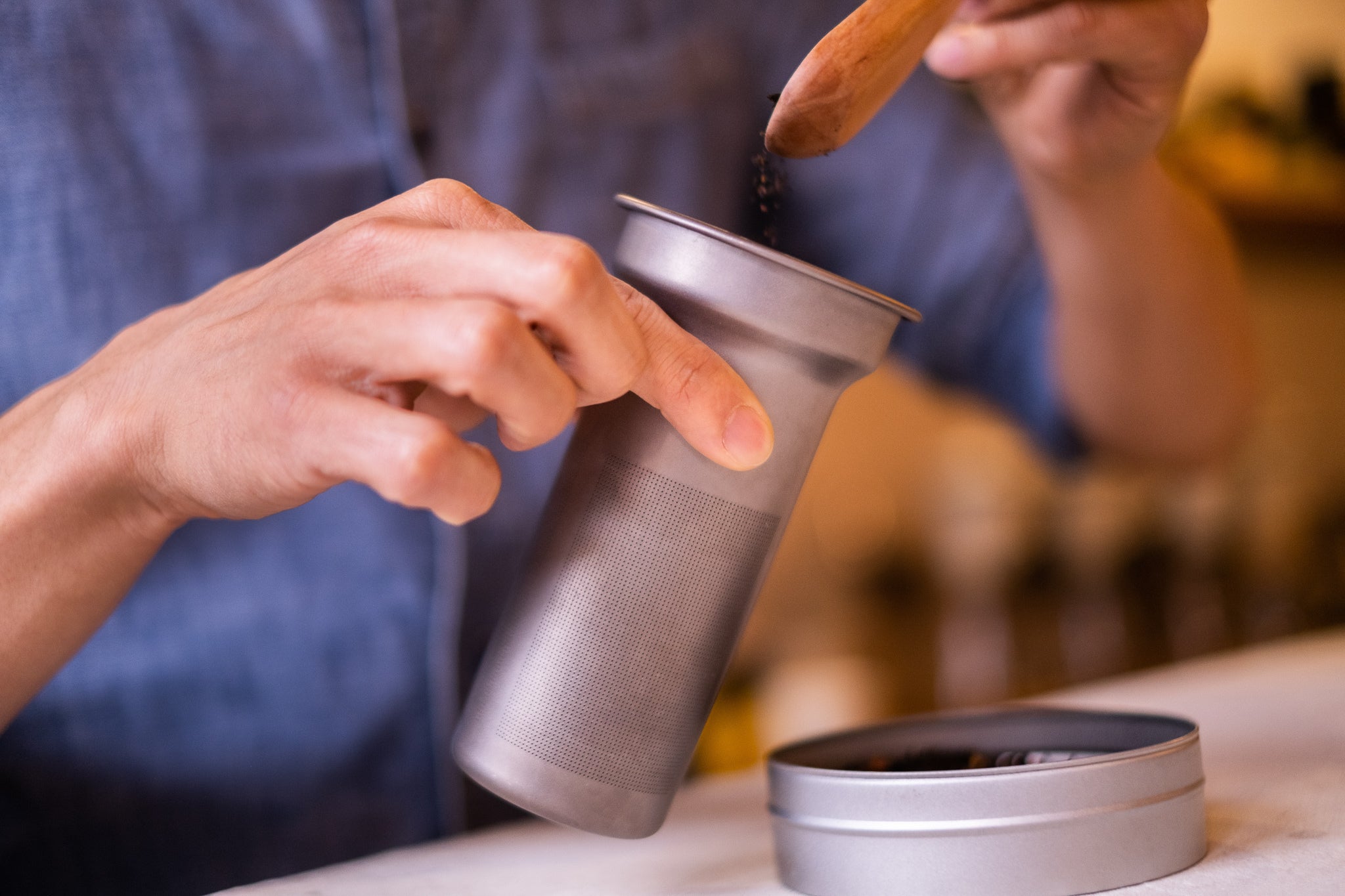 使い方はストレーナーに茶葉を入れて、ケトル本体にセットするだけ。チタン製なので、ケトルの金属臭がお茶に移ってしまうこともなく、茶葉本来の味を楽しめます。