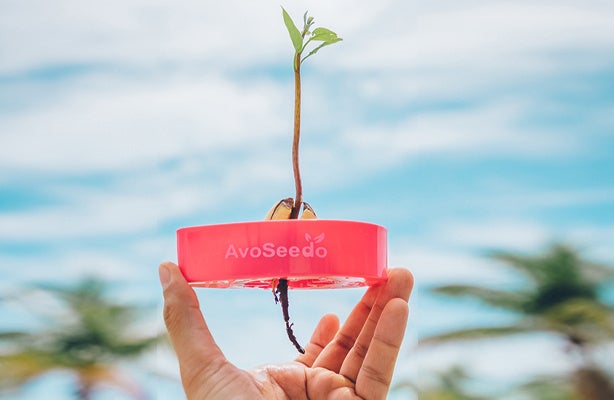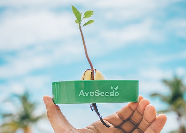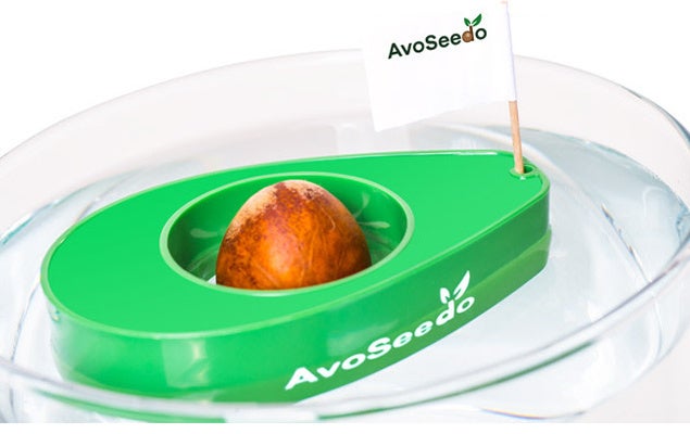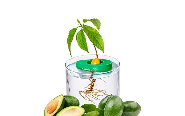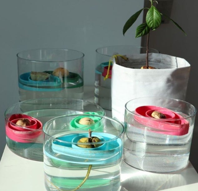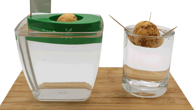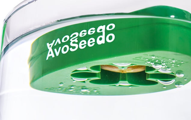スーパーで手に入るアボカドの種を取り出したら、種の皮をむき、水の上に浮かぶ「AvoSeedo」へ乗せるだけ。