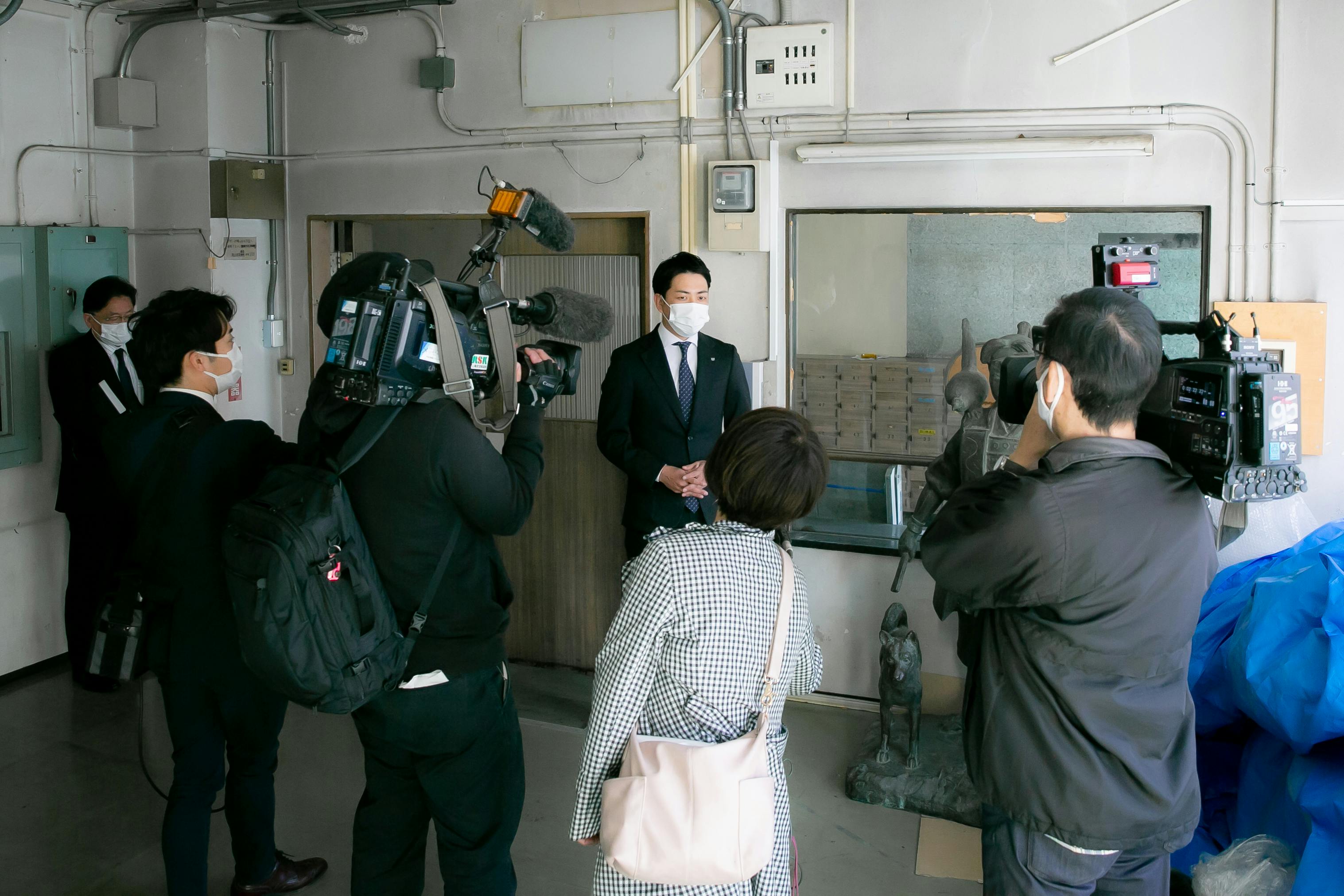 はじめに初代桃太郎像があるJR岡山駅の倉庫にて取材を行い、その後、移設先である岡山桃太郎空港に移動して取材を行いました。
