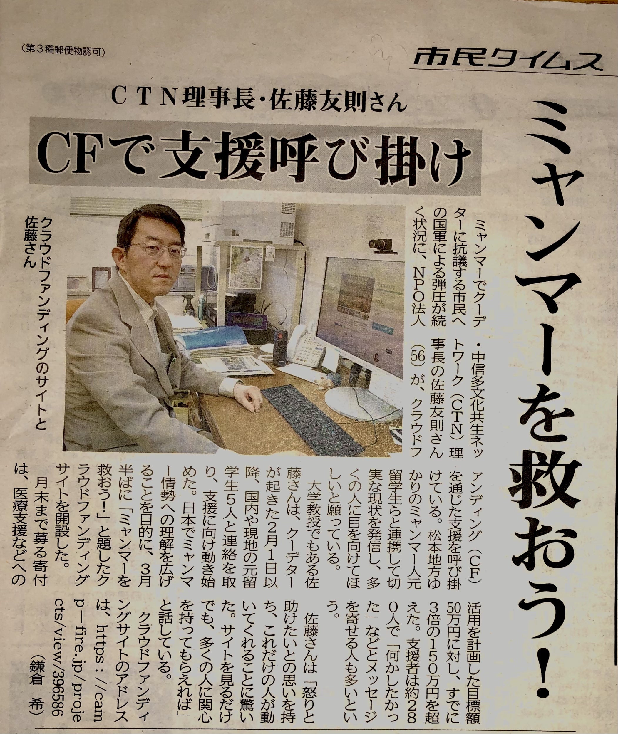 支援者の皆さま 上の写真のように、3/15に始まり1か月半続けてきたこの「ミャンマーを救おう!」クラウド・ファンディングも、残り1日となりました。これまでの支援総額 2,234,500円、支援してくださったのべ人数 375人となります。 本当にありがとうございました! 次は、このお金をどのように使っていくか、ご報告したいと思います。長くなりますが、ご容赦ください。この2週間、ミャンマー人メンバーとずっと検討してきました。まず、3つの重要事項があります。1.この支援金は6月末に入金されます。その2か月の間に、ミャンマーへの直接送金が可能になるケースと、現状のまま送金が不能のケースがあります。その2つのケースについて検討しました。2.このクラ・ファンの本文にありますように、この活動の当初の目的は「(ミャンマー国内の)臨時治療所などの設立資金」でした。現状では、直接送金をして国内にいるミャンマー人メンバーがその活動をすることは不可能ではありますが、当初予定額に近い40万円は、メンバーが活動できる状況になるまで日本国内で保持しておきたいと思います。3.この本文を書いたのは2月中旬でした。その後、現在までに状況が大きく変わりました。直接送金の禁止、不服従運動(CDM)とその参加者への迫害、山岳地の少数民族への空爆とタイへの難民発生などです。それを考慮して使い方を考えました。Ⅰ 今年6月末でも直接送金ができない場合①ミャンマー国民への人道的支援(タイにある支援団体:ビルマ・リリーフ・センター BRC):45万 ←東南アジアの専門家に紹介いただいた信頼できる団体 ②CDM(不服従運動)の支援(日本にあるミャンマー人の支援団体 CDM funding collecting Japan):40万 ③CDM(不服従運動)の支援(日本にあるミャンマー人の支援団体 GenY for revolution Japan):40万 ④タイに逃れた難民への支援(ミャンマー人メンバー(国内組)のタイ在住の親戚 ):40万⑤当初の予定の臨時治療所などの設立資金(日本にいるミャンマー人メンバーが保持):40万⑥クラウド・ファンディング会社の手数料:20万Ⅱ 今年6月末には直接送金ができるようになった場合①ミャンマー国内および国外の難民支援(ミャンマー国内の難民支援団体 DAWKALU Network):35万②ミャンマー国内の医療支援(危険なため匿名希望の団体):35万③CDM(不服従運動)の支援 (日本にあるミャンマー人の支援団体 GenY for revolution Japan):35万④ 当初の予定の臨時治療所などの設立資金(日本にいるミャンマー人メンバーが送金、ミャンマーにいるメンバーが受け取って活動):100万⑤クラウド・ファンディング会社の手数料:20万 このように考えております。タイからミャンマーへのお金の持ち込みは危険であり、かなり活動歴が長く信頼できる団体でなければならないこと、また他の団体も真に信頼できるところでなければ、ということで選定に時間がかかり、皆さんへの報告が遅くなりました。申し訳ありません。 今後も情勢の変化により変更の必要があるかもしれませんが、その都度、考えていきたいと思います。 よろしくお願いいたします。