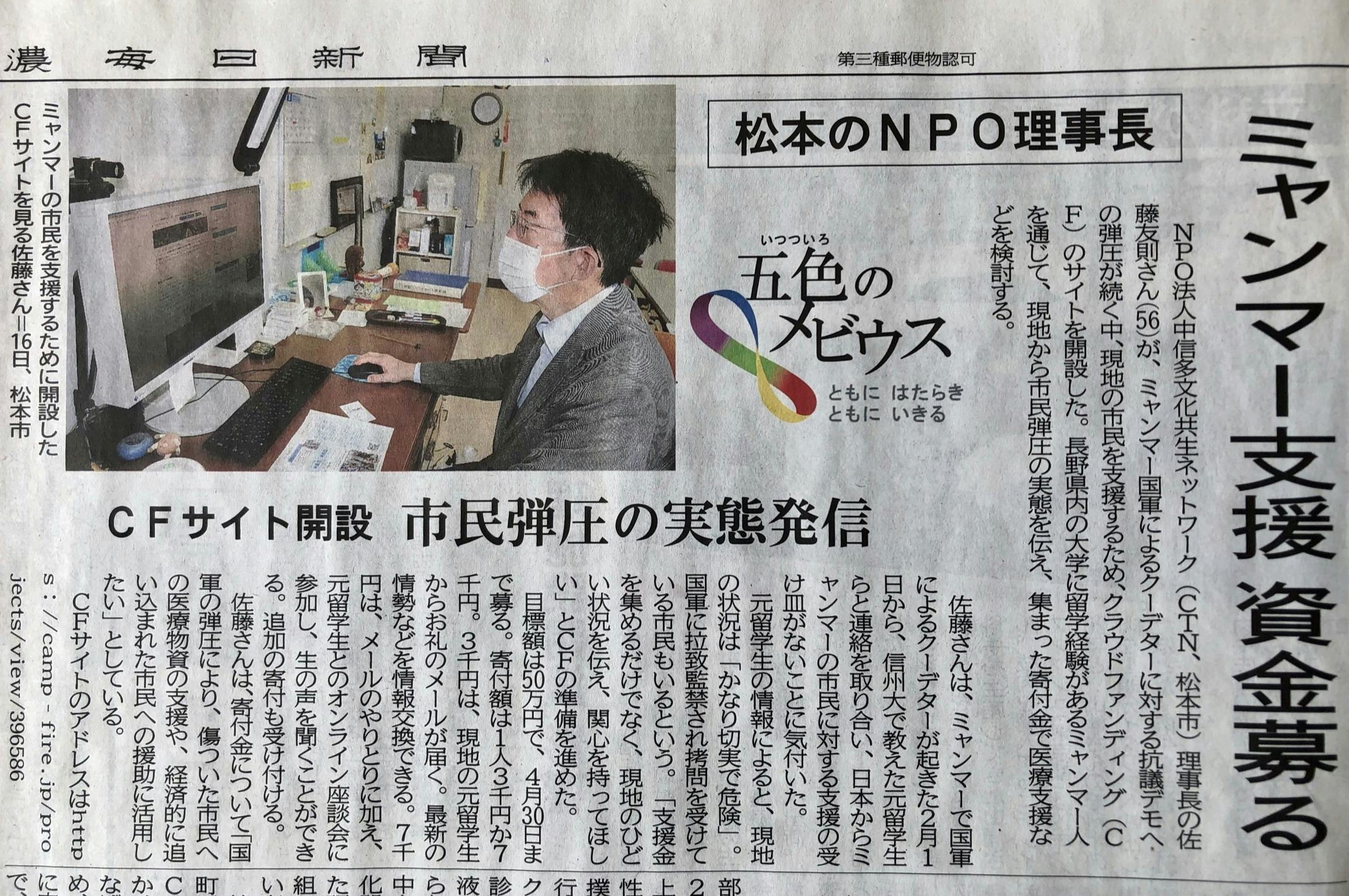 長野県の新聞『信濃毎日新聞』3/17付で「ミャンマーを救おう!」クラウド・ファンディングが取り上げられました。頭ぼさぼさの私の写真ものっています。記事はこちらです。