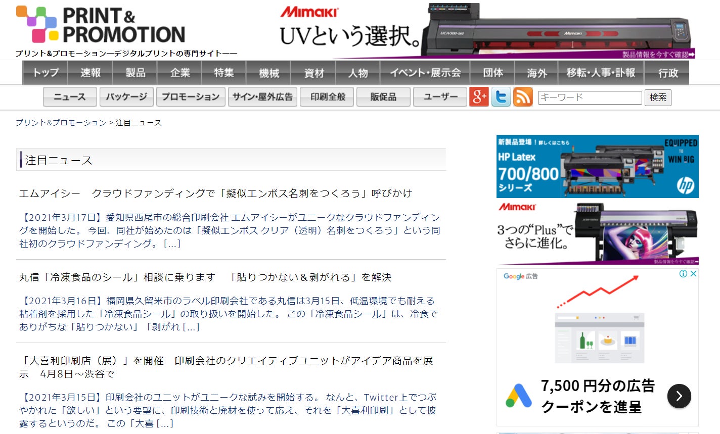 印刷関連のニュースサイトの「注目ニュース」に