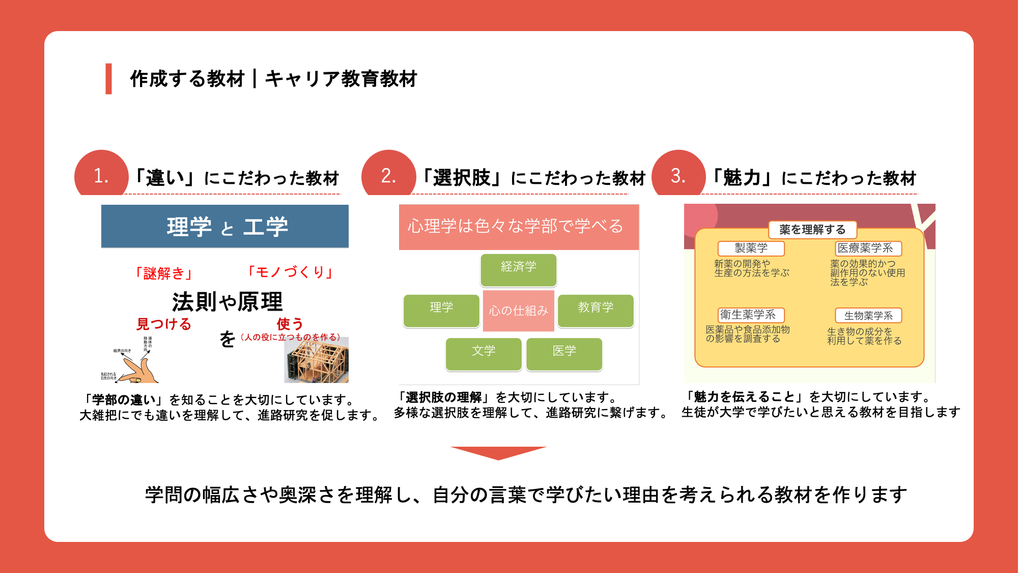 進路決定のための情報を補完し、生徒が真剣に考える期待に応える教材を作ります。