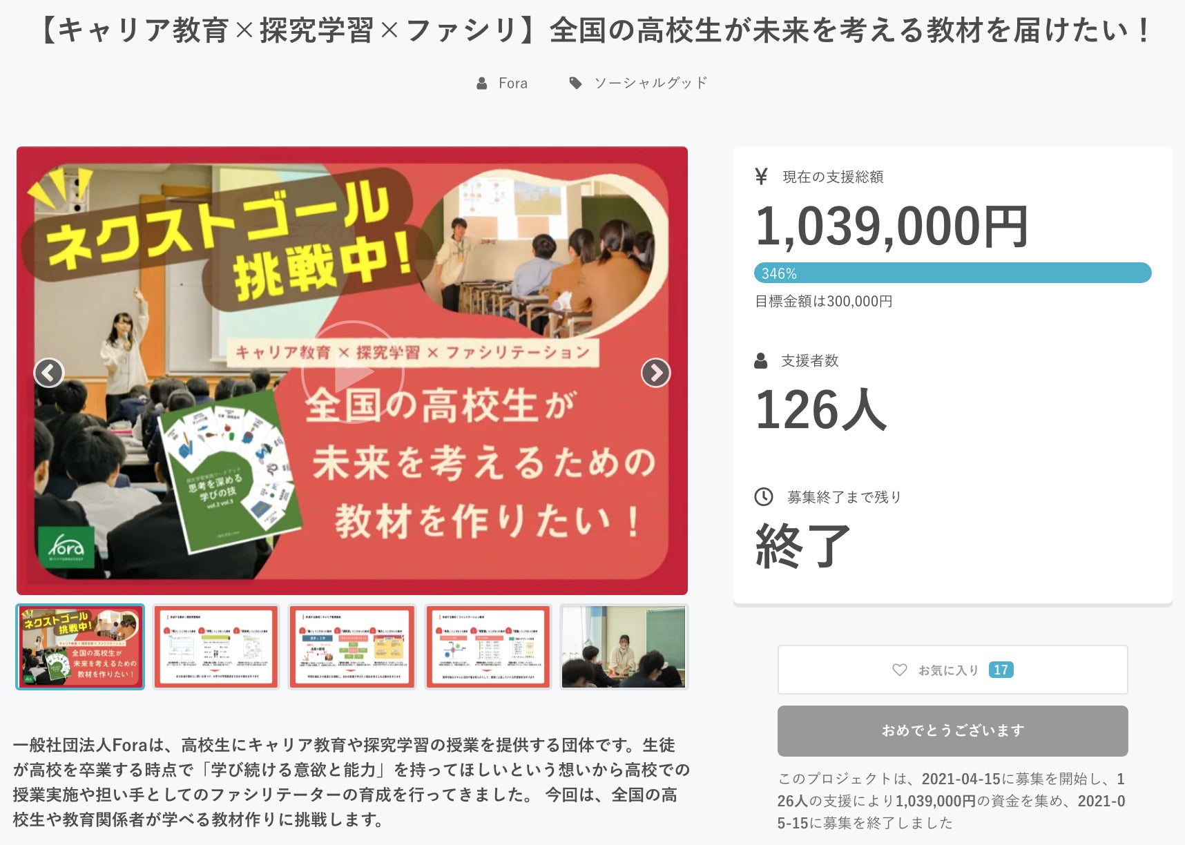 2021/05/17 20:00こんばんは。一般社団法人Fora 代表理事の藤村琢己です。5/15(土)にクラウドファンディングが終了いたいましたので、この場を借りてご報告とお礼をさせていただきます。※リターン別のサンクスメールは随時お送りいたします。クラウドファンディングの結果126人の支援者さまから、1,039,000円のご支援をいただきました。本当にたくさんのご支援をありがとうございました。開始2日足らずでファーストゴールだった30万円を達成することができ、想定以上のスピードでご支援いただいたのもあり、ネクストゴールを100万円という大きなゴールに設定させていただきました。また、今回クラウドファンディングを実施したGood Morningさまの推薦プロジェクトに選んでいただき、サイトトップにも掲載いただくなど、多くの場面で背中を押していただくプロジェクトとなりました。ご支援・応援していただいた皆さまへ期間中、ご支援いただいた方はもちろん、多くの方から応援のメッセージやシェアをいただきました。終了した今も、プロジェクトを見てくださった方からの声をいただいております。皆さまからのご声援をいただく度に、身の引き締まる思いです。これまで5年間行ってきた活動の中で積み重ねてきたことを、「教材」という形で形にしていくのは、私たちにとって大きな挑戦です。その挑戦を、皆さまが応援してくださっていることを忘れずに、教材作成含め、日々の活動に取り組んで参ります。教材作成の様子や、今後の活動につきましては、随時こちらの活動報告で行います。あたたかく見守っていただけますと幸いです。改めまして、本クラウドファンディングを応援いただいた皆さま、本当にありがとうございました。今後とも一般社団法人Foraをよろしくお願いいたします。2021年5月17日一般社団法人Fora 代表理事 藤村 琢己 もっと見る