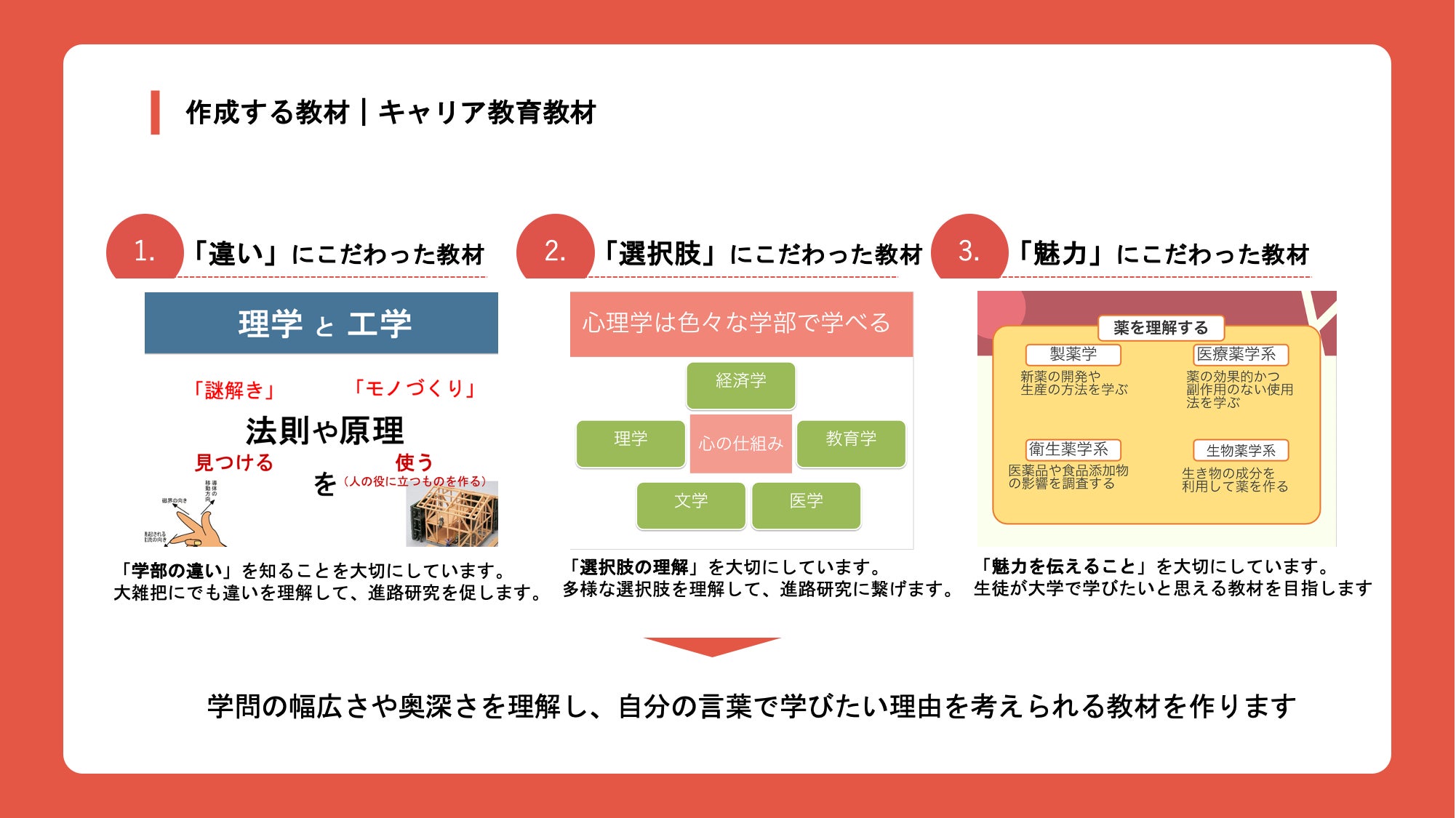 進路決定のための情報を補完し、生徒が真剣に考える期待に応える教材を作ります。