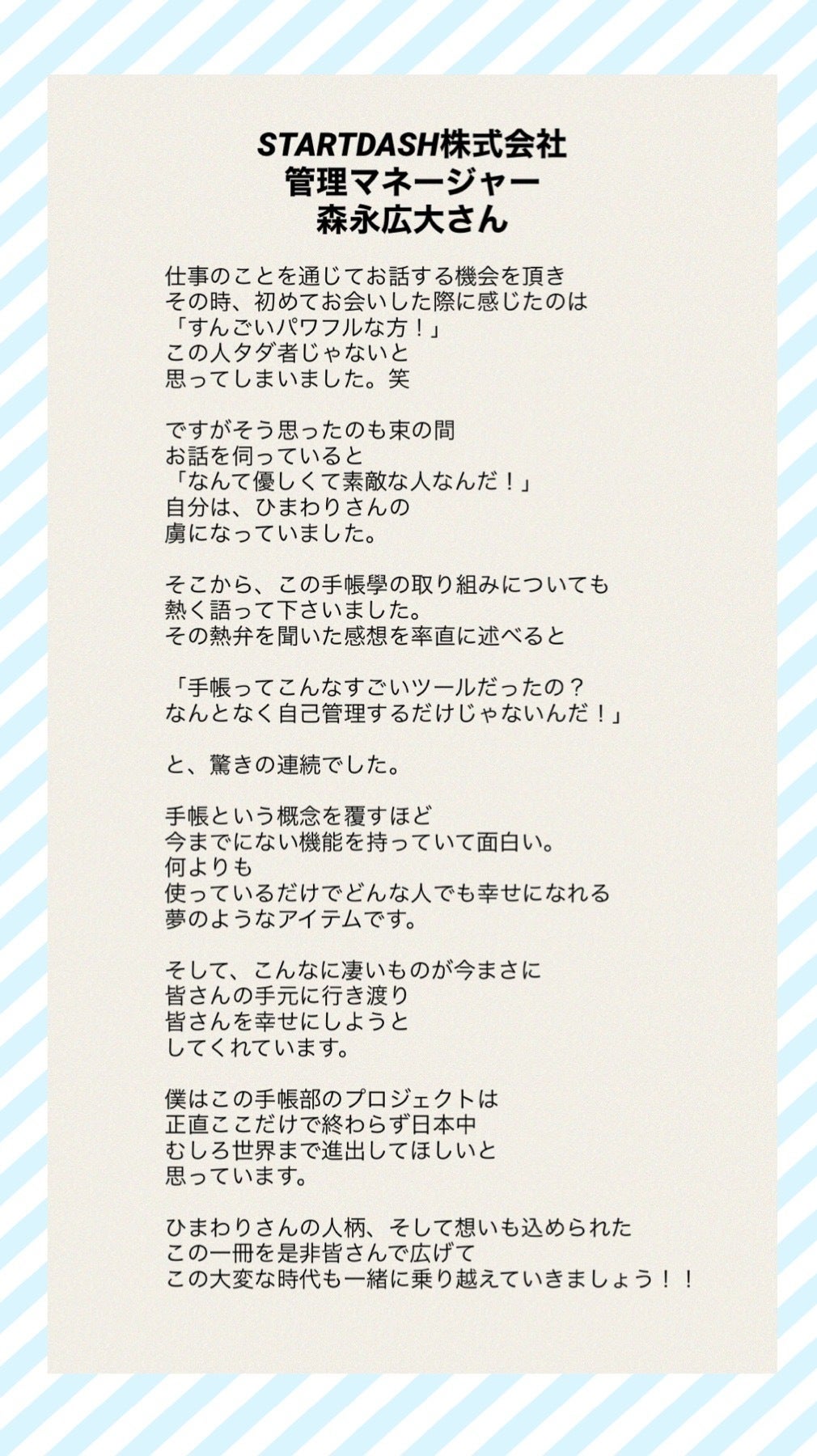 さて、今日はひまわりとしての活動にて頂いた企業の方からのメッセージを紹介いたします。