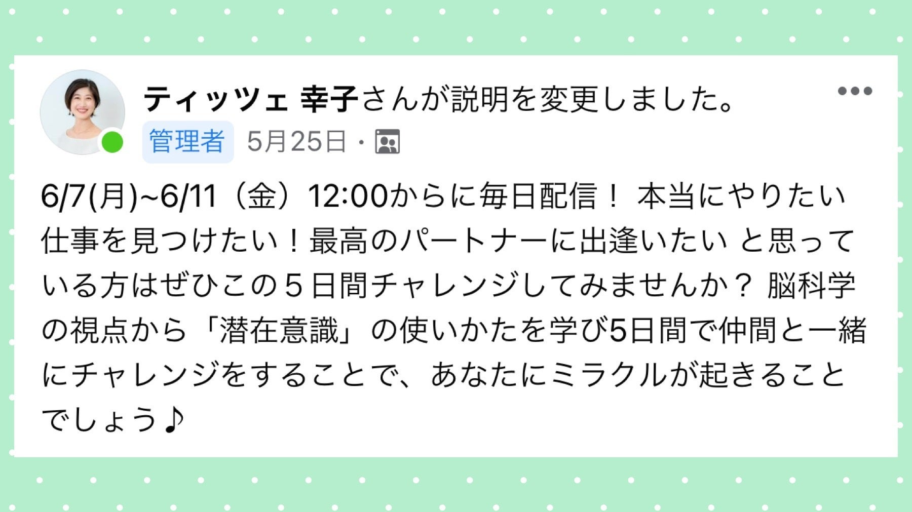 なんと!この、「潜在意識で仕事もパートなーも引き寄せる5Daysチャレンジ」と題したFacebookライブ配信に、私も出演させていただきます٩(*´︶`*)۶