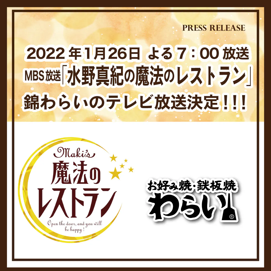 2022/01/25 16:00以前はご支援いただきありがとうございました☺主力の飲食店は、酒類販売が可能になり、営業時間も伸び、少し明るい兆しが見えてきたものの、またコロナの拡大により影響があり、厳しい現状ですが、少し嬉しいことがあり、以前応援頂いた、ご支援者様に、お知らせ活動報告を入れさせてただきます。(^^)株式会社治元が運営するお好み焼・鉄板焼のお店「京都 錦わらい」がMBS放送のTV取材を受けました。2022年1月26日 よる7:00からの「水野真紀の魔法のレストラン」で、放送されます。※関西圏の放送の為、エリア外の場合はTVerの見逃し配信で!魔法のレストラン公式ホームページよりぜひ、次週予告をチェック!!https://www.mbs.jp/mahou/■番組情報番組名:MBS放送「水野真紀の魔法のレストラン」放送日:2022年1月26日(水)よる7:00出演者:水野真紀・長野博・管広文(ロザン)・宇治原史規(ロザン)・スッチー/ゲスト:ギャル曽根 ※敬称略 出演お好み焼チェーン:ゆかり(社長)・ぼてぢゅう(営業部長)・京都 錦わらい(専務取締役 塩田)『関西3大お好み焼きチェーン ライバル対決』2018、2019年と過去2回開催、毎回好評だった「お好み焼き対決」の第3弾。数あるお好み焼き店の中から候補にあがり、オファーを頂きました。関西人のソウルフードであるお好み焼きの人気チェーン店のキーパーソンが、お相手になるお店について「ここが悔しい」「ここがスゴい」を言いあいながら、各チェーンの魅力や情報を紹介する内容となっています。 創業昭和25年・お好み焼「 ゆかり」さん、大阪のお好み焼き専門店「ぼてぢゅう」さん、そして、京都発祥 お好み焼・鉄板焼「錦わらい」の3チェーン店で出演致しました。弊社からは、専務取締役の塩田が「わらいの魅力」と「お好み焼きへの愛」を熱く語っています。■公式通販サイト「元蔵別館」 https://shop.nisiki-genzou.com/コロナ禍、飲食店にとって厳しい現状が続いていますが、このような機会を頂き、大変嬉しく思います。今後も、感染対策をしっかりとって、政府・自治体の要請に応じながら、笑顔で店舗営業して参ります。通販事業にも注力し、治元公式通販サイト「元蔵別館」をリニューアルしておりますので、一度ご覧いただけると幸いです。 もっと見る