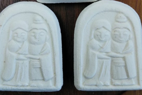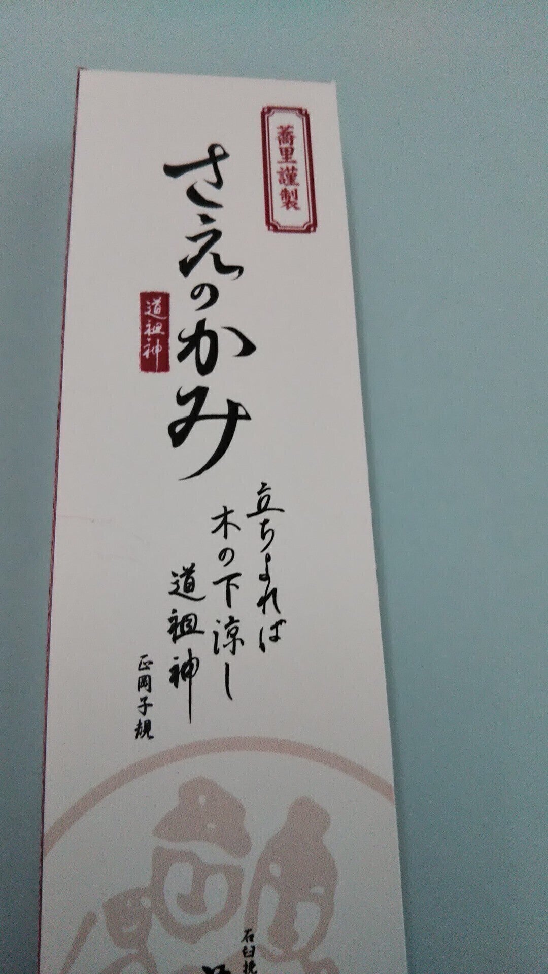 ここに私が、知り合いのお菓子屋さんと協力して作った「道祖神」というお干菓子があります。小さな蕎麦屋ですが、その庭に祀ってある神様をモチーフにしたお干菓子です。道祖神は、各地土着の神様で邪気や疫病が村に入って来ないよう、主に信州安曇野などで路傍に祀ったお地蔵様です。