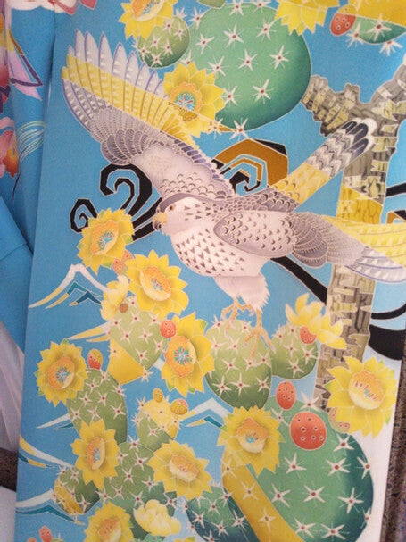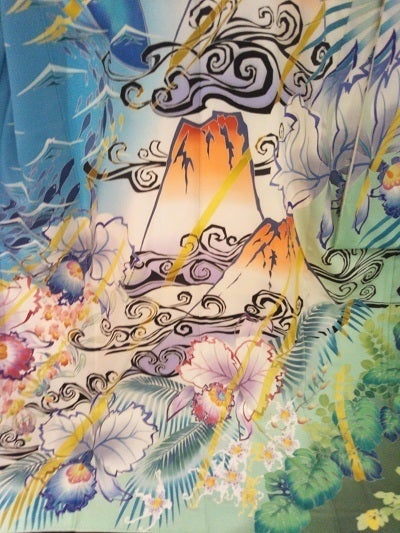 この着物を制作された作家の赤地暁さんは、東京のエクアドル大使館にバルベリス駐日大使を訪問して、エクアドルという国について深くお聞きになり、この着物のデザインに着手されたとのこと。行かれたことがない国を、着物という1枚のキャンバスに描かれ、それを伝統技術をもって作り上げるのには、相当の熟練した技とイマジネーション、さらにはプレッシャーやご苦労があったのではないかと思います。