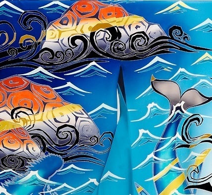 出来上がった着物は、まさに日本とエクアドルを最高に美しく繋げる「架け橋」となっていました。エクアドルの多様で緻密な自然の美しさと繊細な着物という文化が、見事に組み合わさり、火山、ゾウガメやイグアナ、クジラ・・・など一見着物と合いそうにないものが、作品の上に乗ると不思議と違和感なく感じられました。そしてモデルさんに着てもらって、一層良く馴染み、まるで日本とエクアドルの文化が融合して溶けた感覚さえ感じることができました。