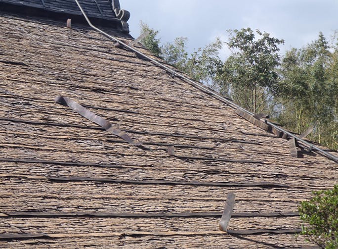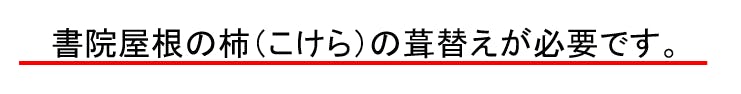 観音寺書院は、寺伝によれば、貞享2年(1685)に永原御殿(野洲市)から移築されたとあり、国の重要文化財に指定されています。屋根は柿葺きの入母屋造の建物で昭和56年(1981)の屋根の葺き替え以降、柿(こけら)の劣化が激しい状態になっています。また耐震対策も必要です。
