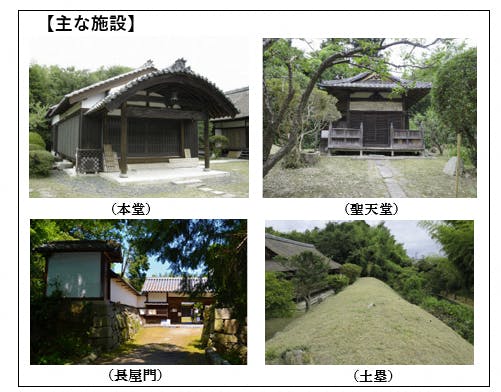 主な施設として、倉・表門を含む長屋門や内堀、観音寺阿弥陀堂、観音寺書院の他に、本堂(平成24年に再建)、庫裏、聖天堂、納豆蔵、土蔵等がある他、高塀や土塁、石灯籠、ツツジや観音寺椿といった木々が繁り、名刹としての趣きある空間が広がっています。
