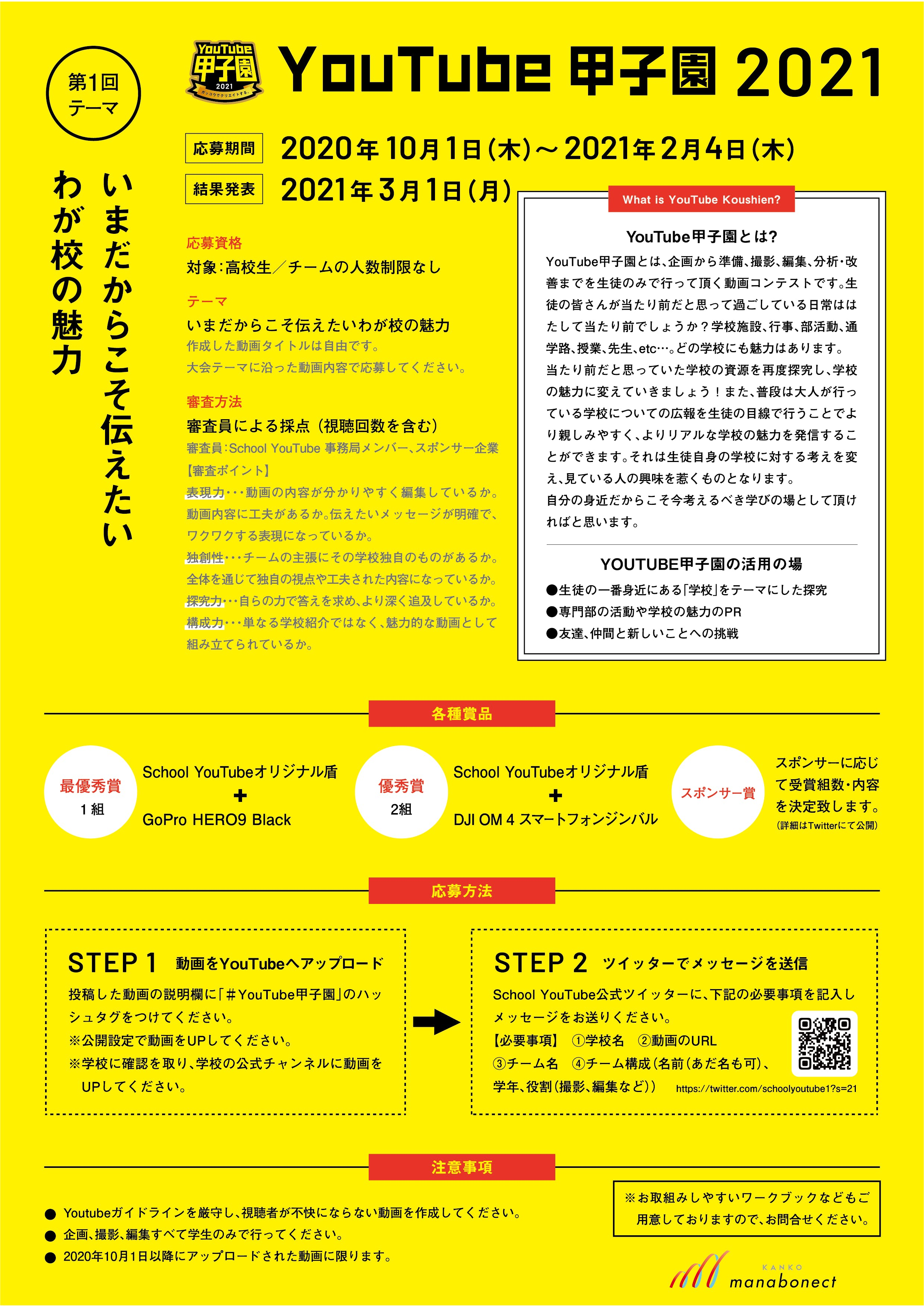 YouTube甲子園は大人が作った学校のPR動画とは違い、あなたたち目線のリアルな学校の魅力を発信するコンテストです。生徒・先生・授業・勉強・地域・行事・部活・・・×やってみた。新しいことにチャレンジする○○をYouTube動画で発信しよう!