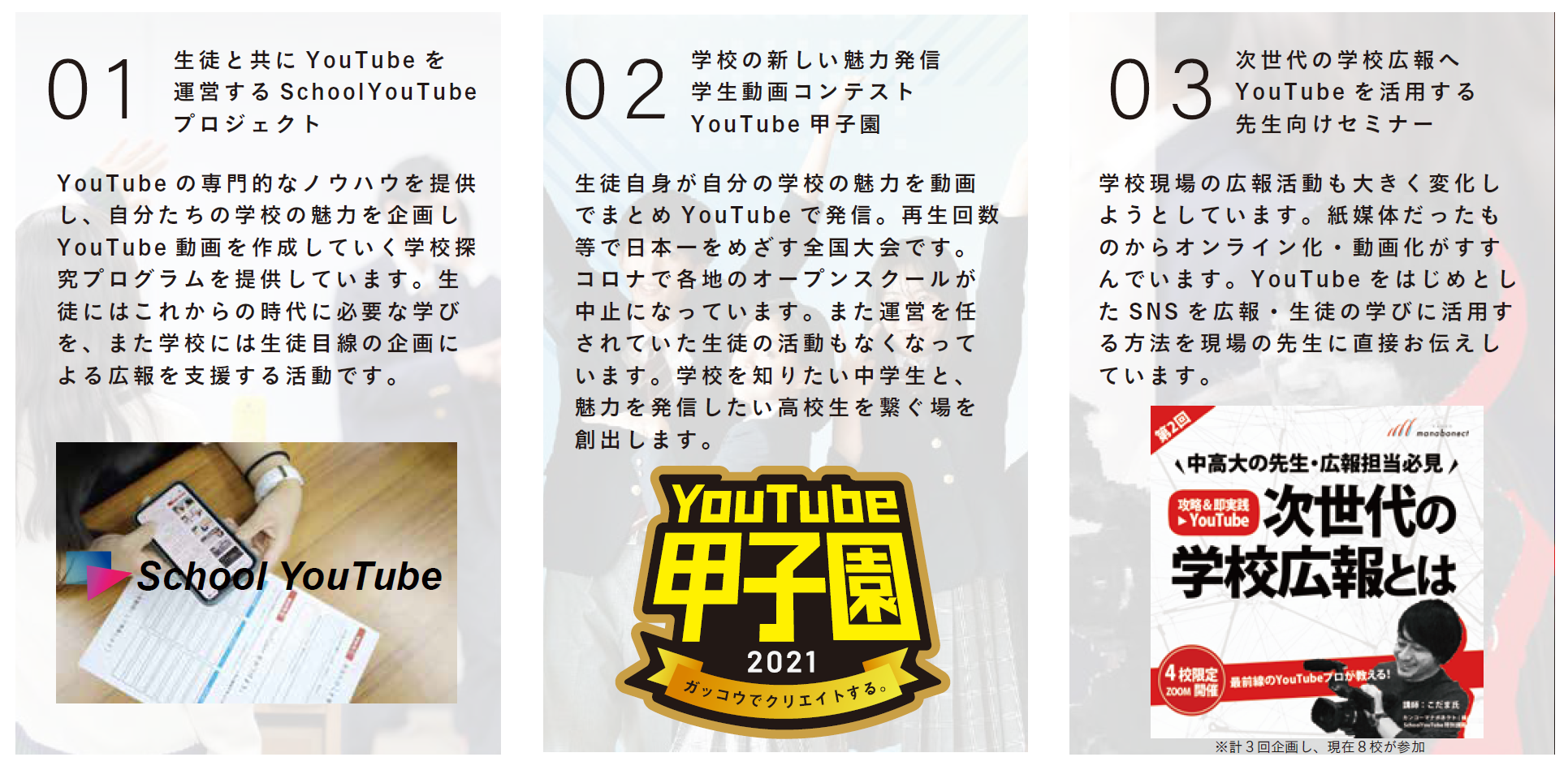 私たちはこうしたYouTube甲子園のほかにも、学生や学校に、『学び』や『学校の魅力発信』にもYouTubeを積極的に活用してもらうために生徒と実際にYouTubeチャンネルを運営する『SchoolYouTubeプロジェクト』や、先生向けの『YouTube活用セミナー』などを開催しています。