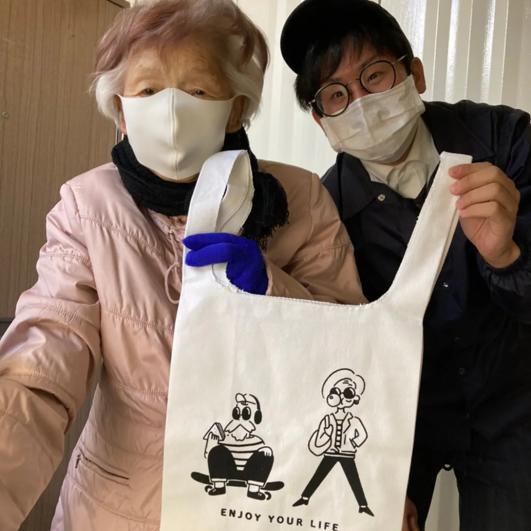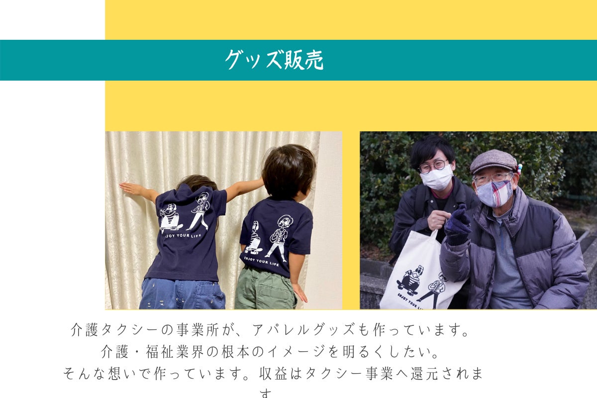 go out taxiのロゴや車体は、とってもPOPです。これは、福祉という世界をもっと身近に感じてもらい、期待感を持ってもらいたいという想いを込めて創りました。コンセプトである「ENJOY YOUR LIFE」の通り、イメージキャラクターのK太とK子は人生を楽しむ天才たち。いくつになっても、自分のたった1度の人生を謳歌しています。介護タクシーの車体にもPOPなイラストをデザインすることで、一際目を引きます。よくお子様に「あれ、なにー?」と指を差されますが、そうやって目に留めてくれることが何より嬉しいです。医療や福祉の現場にはないデザインだからこそ、POPで明るいイメージに変えることに繋がると思います。また同時に取り組んでいるのが、POPなデザインを利用したアパレルグッズ。今回のリターンにもしています。アパレルグッズにすることによって、介護や福祉とは関わりが少ない方も手に取り、興味を持ってもらえるきっかけにしたいです。