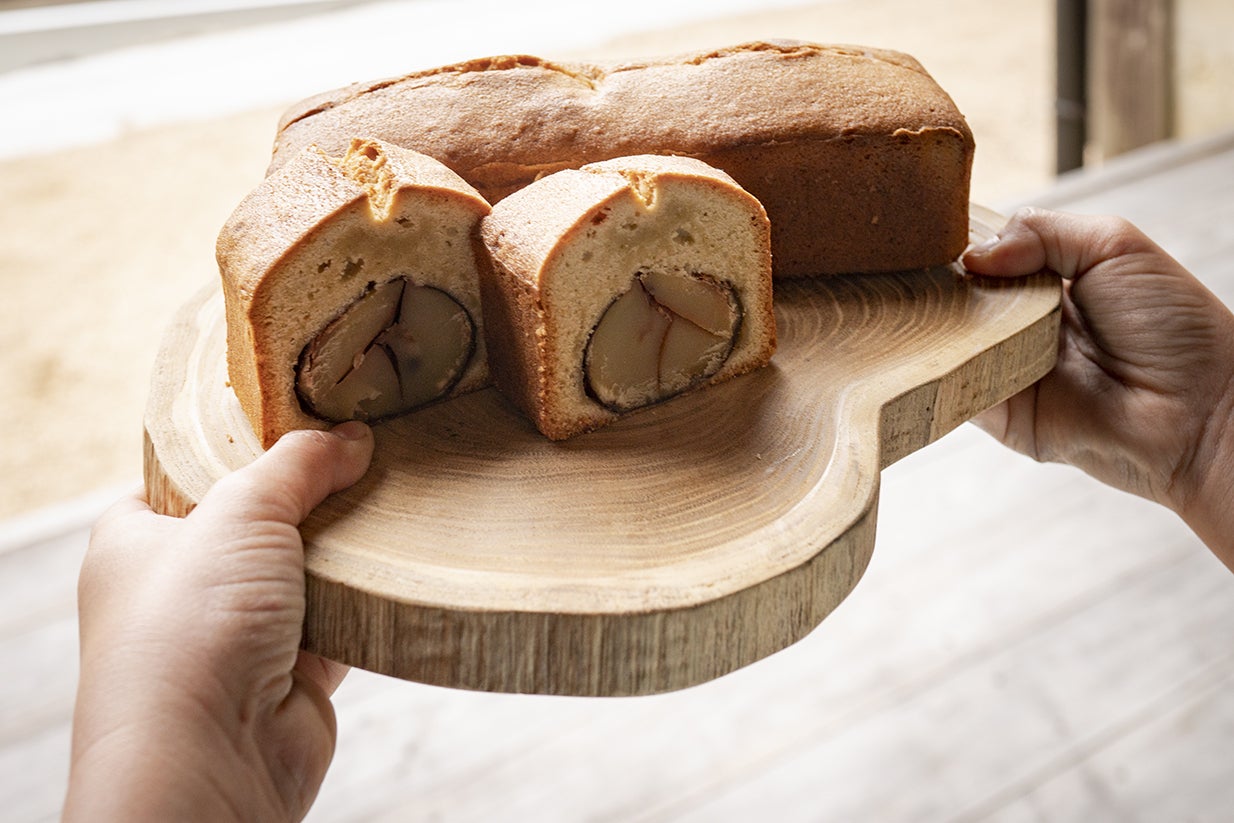 そして、ついにお客様の声を元に完熟石畳栗を存分に味わっていただけるスイーツが出来あがりました。3L以上の大きな渋皮煮がしっとりとした生地に包まれたパウンドケーキです。
