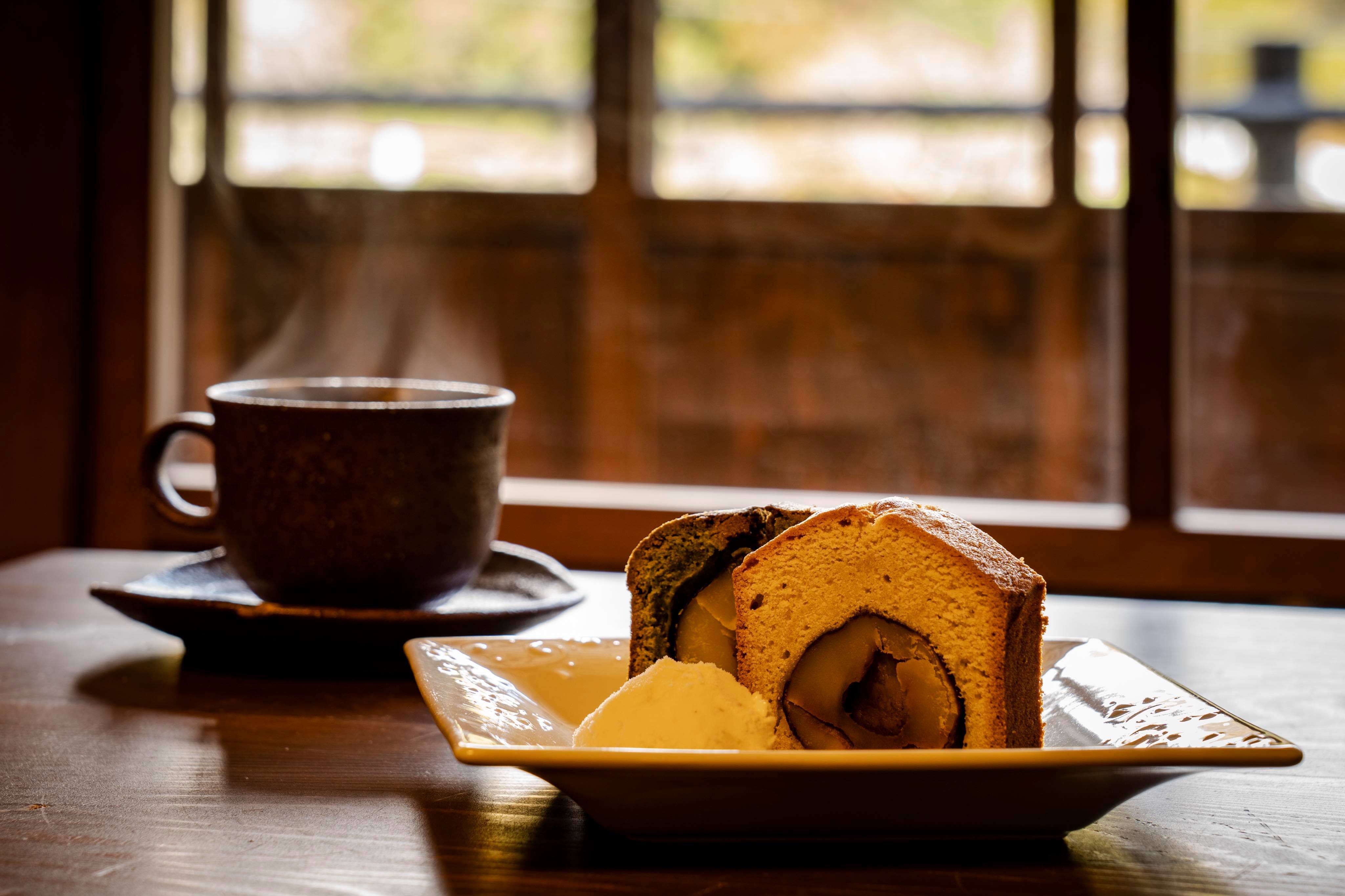 トッピングはジェラートが欠かせない。完熟石畳栗をふんだんに使用したジェラートも、セットとして準備しております。ワインの世界にマリアージュがあるように、スイーツの世界にもマリアージュがあります。お皿にジェラートとパウンドケーキを乗せ、贅沢な一皿を味わっていただきたいと思います。