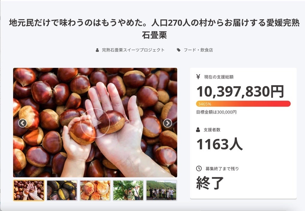 2021/03/31 13:06石畳つなぐプロジェクトの寳泉です。 クラウドファンディング『人口270人の村からのおんがえし!新スイーツ第2弾、愛媛完熟石畳栗のパウンドケーキ』は、3月30日をもちまして受付を終了いたしました。今回は181名の皆様からご支援いただき、あらためまして厚くお礼申し上げます。4月以降、順次製造・発送させていただきますので、しばらくお待ちくださいませ。 今回は、リターン商品のパウンドケーキが受付終了の1週間前に品切れとなり、「申込みできなかった」というお問い合わせも何件かいただきました。誠に申し訳ありません。クラファンでお申し込みできなかった方には、今年収穫の栗で11月以降にネット販売等でお届けできればと思っておりますので、よろしくお願いいたします。 さて、石畳では桜のシーズンが終わり、木々の芽吹きの季節へと移ってきました。栗の木も気温が上昇するにつれ、芽吹きから枝の伸長、開花、結実へと急速に成長していきます。 人口270人の村の過疎の進行を止めたい、そして自然豊かで美しい石畳の風景を後世に残していきたいと思いで活動している私たちも、多くの皆様からのご支援で一歩ずつ前に進むことができています。これからも皆様との関係を大切にし、ともに石畳の未来を切り開いていくという覚悟で取り組んでいきたいと思います。今回ご支援いただいた支援金は、「囲炉裏カフェひぬるわ」営業再開にむけた準備・広報活動等に役立てさせていただきます。現在もコロナ収束が見えない状況ですが、Facebook等で進捗状況等、情報発信をしていきたいと思いますし、新たな展開も企画中ですので、引き続きご支援をよろしくお願いいたします。 もっと見る1億年の恵みと情熱と