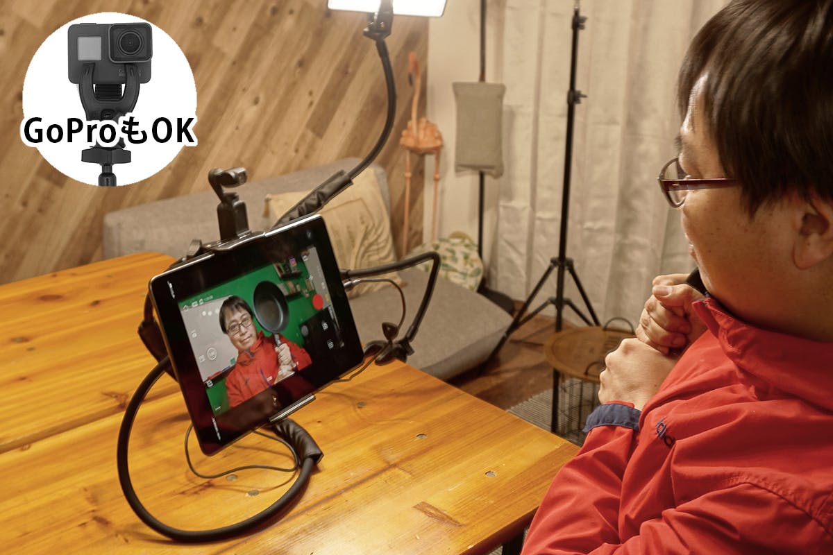 ▲YOUTUBE撮影等に超絶便利!! DJI POCKET2やGoProと大型タブレットを組合わせ、撮影時には両方の機材を同時利用できるスタンドとして使うこともできます。カメラ用・タブレット用と、別々のスタンドに分ける必要はないのです!