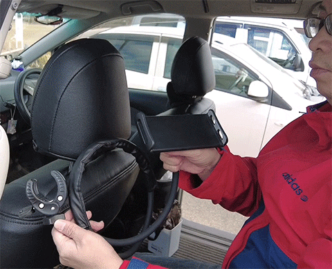 ▲座席のヘッド部を利用して、くるっと巻き付けて、かぎ爪でしっかりと固定ができます。フレキシブルポールだから、いろんな画角で楽しめますね。