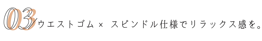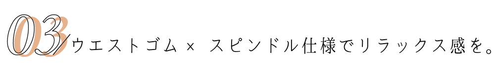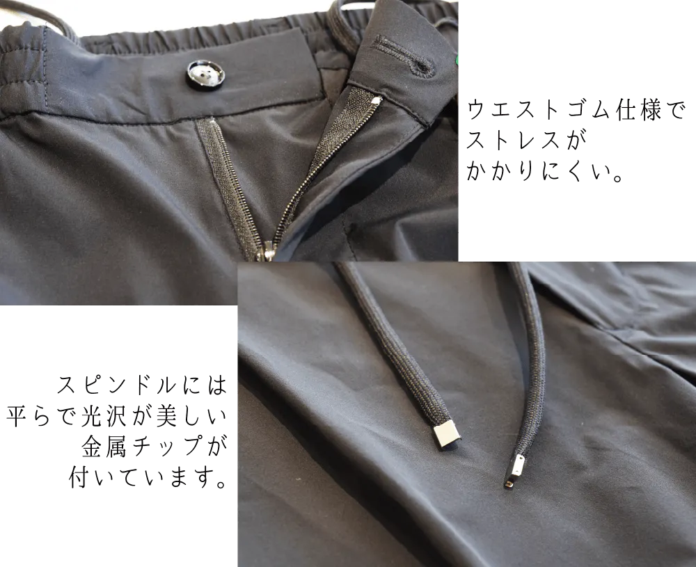 パンツはトレンドでもあるウエストゴム・スピンドル仕様にて利便性に優れ、リラックス感があります。